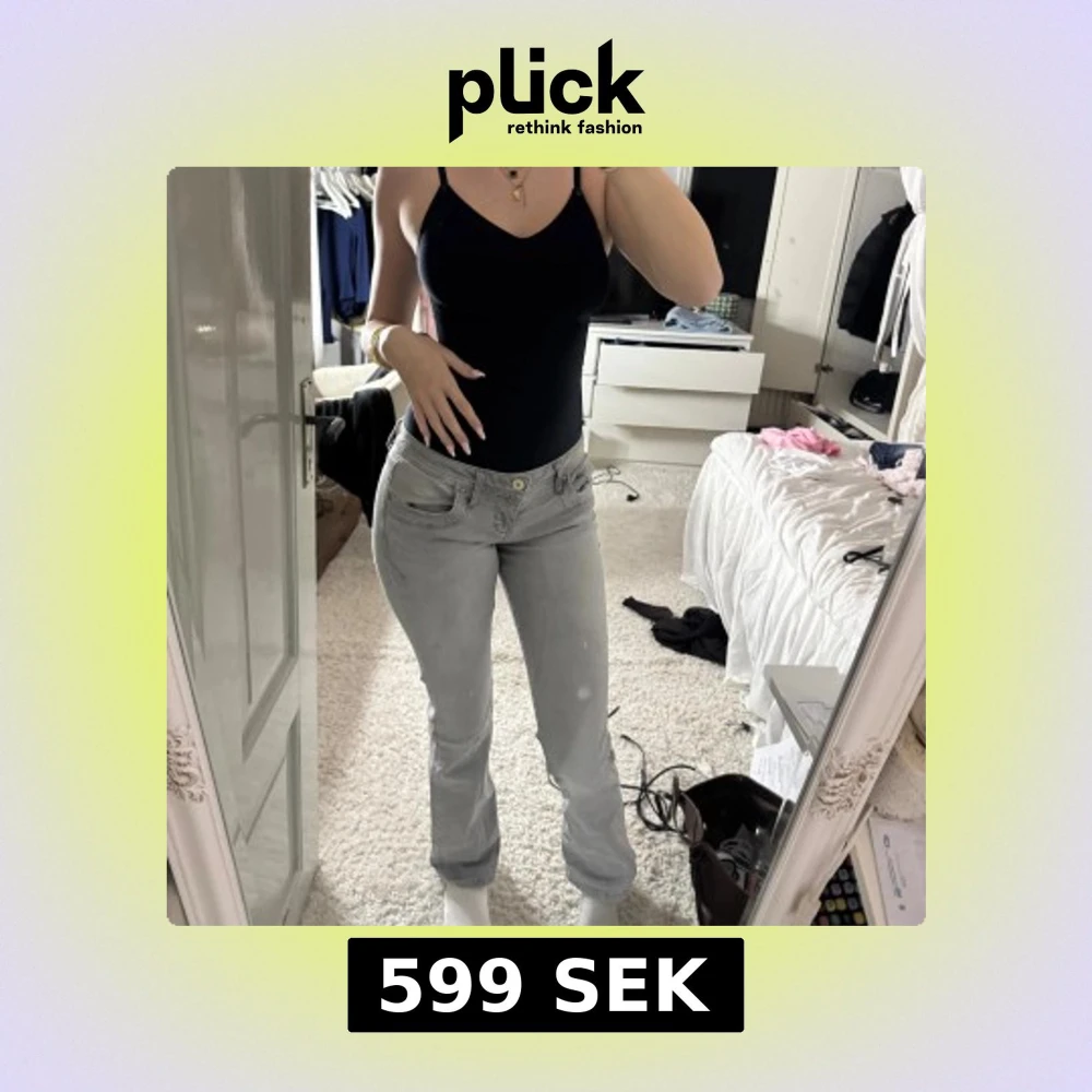 Säljer ett par ljusgrå jeans med låg midja och raka ben. Jeansen har klassisk femficksdesign, silverfärgade knappar och är tillverkade i mjukt denimtyg. Perfekta för en chill och stilren look. Storlek w26/l32, S