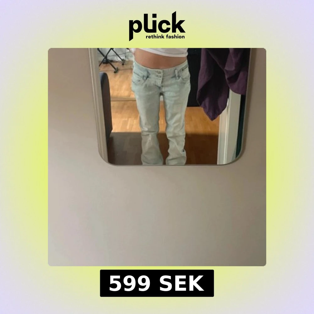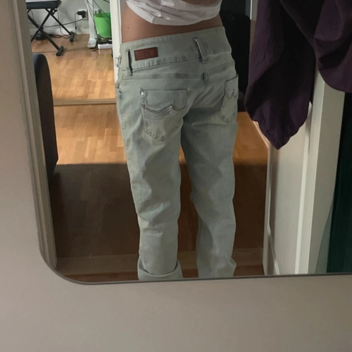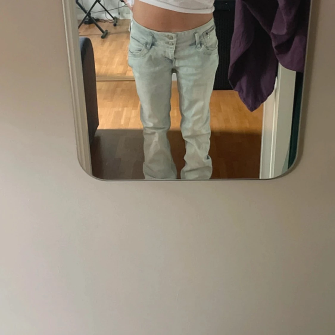Säljer ett par ljusblå jeans med butcut och låg midja. Jeansen har klassiska fem fickor, snygga sömdetaljer på bakfickorna och är tillverkade i mjukt denim. Perfekta för en avslappnad och trendig look. Stl 29W 32L. Midjemått är 40 och innerbenslängden är 77. Lånade bilder