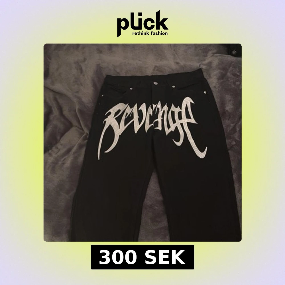 Snygga svarta byxor från Revenge med ett stort vitt tryck på framsidan👀. Byxorna har en klassisk femficksdesign och knappgylf. Perfekta för en edgy look🫠😤.
