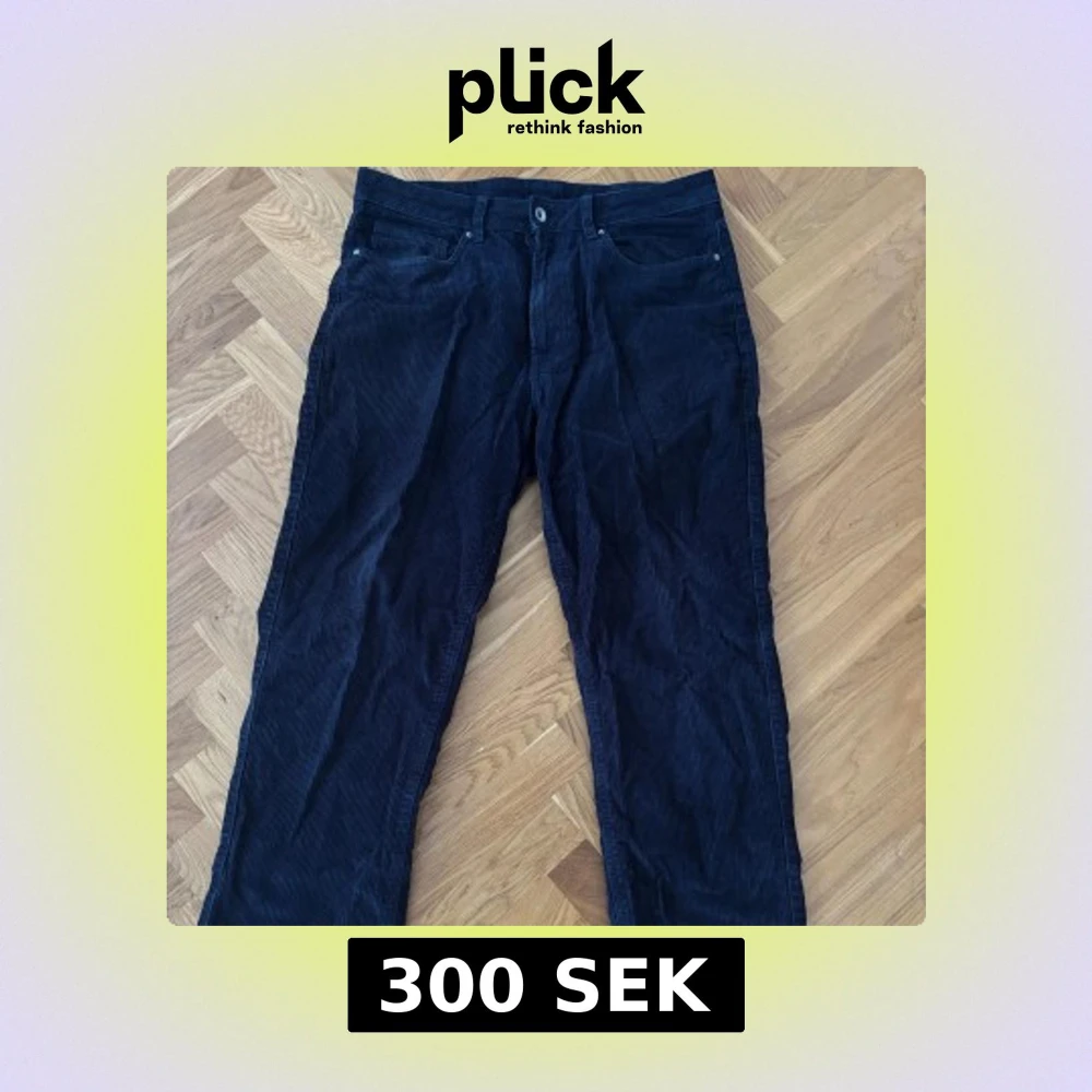 Säljer ett par mörkblå manchesterbyxor med klassisk femficksdesign och raka ben. Byxorna har normal passform och stängs med knapp och dragkedja. Perfekta för dig som gillar en tidlös stil med lite retrovibe.
