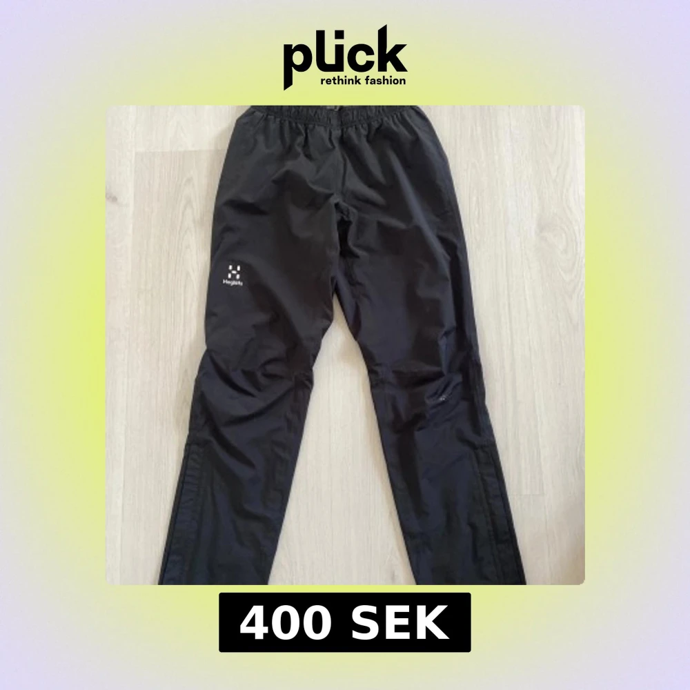 Svarta täckbyxor från Haglöfs i storlek M. Byxorna har elastisk midja, meshfoder och är tillverkade i ett vattentätt syntetmaterial (PROOF™). Perfekta för utomhusaktiviteter när det är blött eller kallt. Liten skada på ett av knäna.