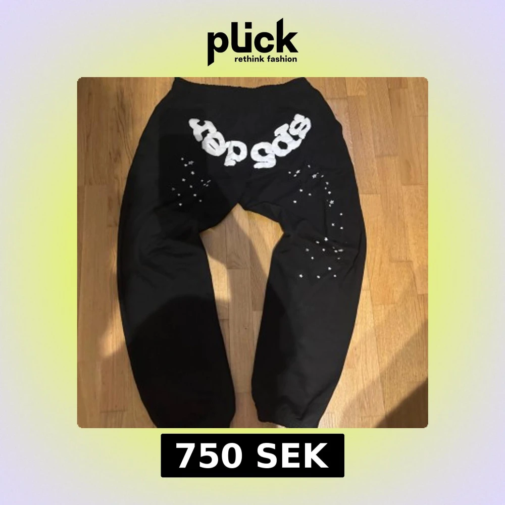 Svarta mjukisbyxor från Spode i storlek M med resår i midjan och benslut. Framsidan har ett stort vitt tryck med texten 'spode' och små vita stjärnor som dekoration. Byxorna är i bomull och har en avslappnad passform. ⚠️1:1⚠️