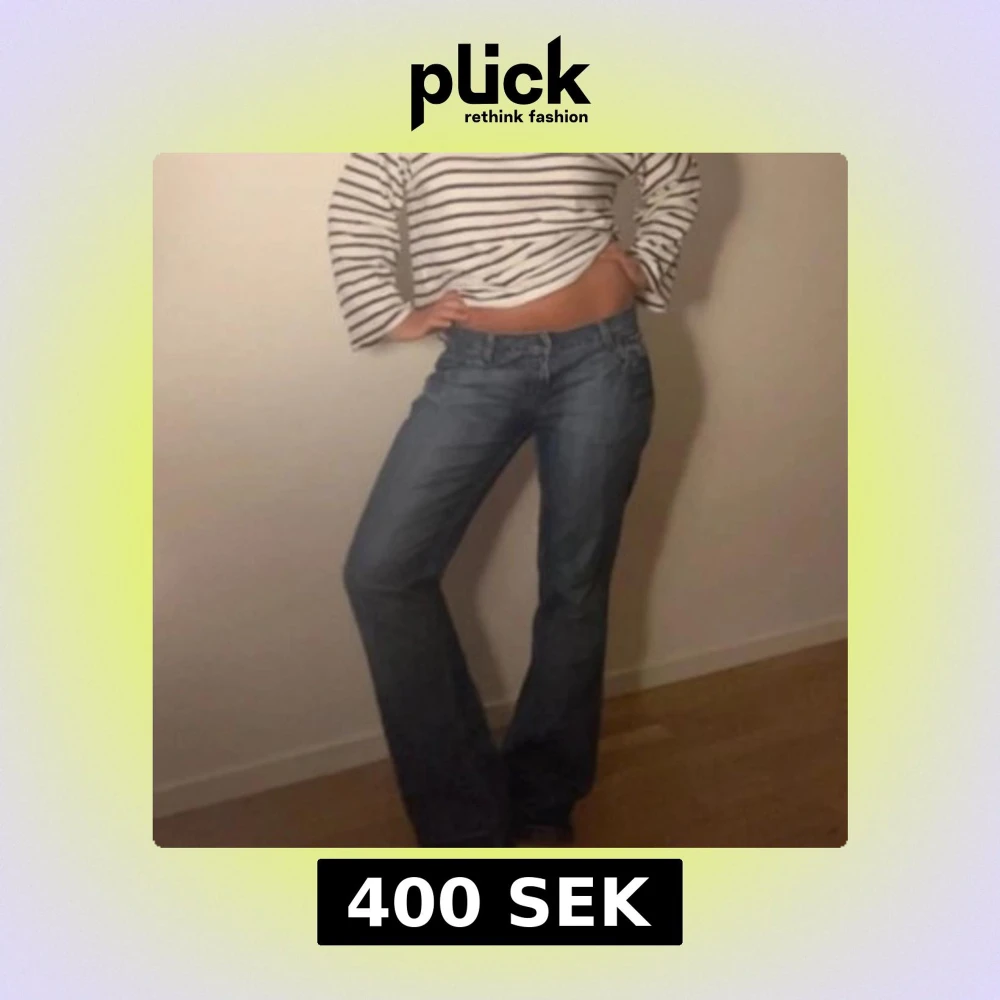 Säljer ett par blå jeans med bootcut-modell och låg midja. Jeansen har klassisk femficksdesign och är tillverkade i denim. Perfekta för dig som gillar en avslappnad men ändå snygg stil.