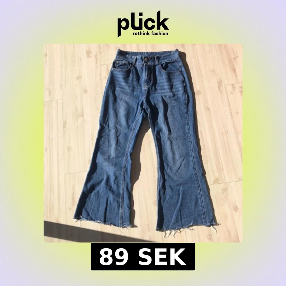 Säljer ett par blå jeans med fransiga kanter och en bootcut-stil. De har en klassisk femficksdesign och knäppning med dragkedja. Perfekta för en avslappnad look.