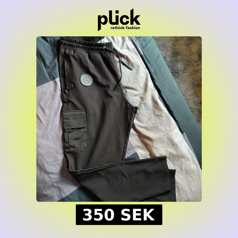 Säljer ett par svarta cargopants från OFF med elastisk midja och dragsko. Byxorna har stora fickor på sidorna, dekorativa detaljer med dragkedja och nyckelring samt OFF-logga på ena benet. Perfekta för en streetwear-look.