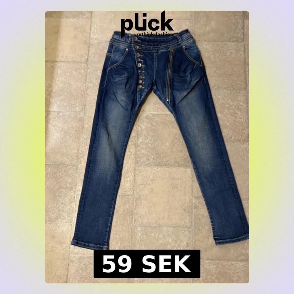 Säljer ett par blå jeans med unika detaljer som sned knäppning med flera knappar och en synlig dragkedja framtill. Jeansen har smal passform och klassiska fickor fram och bak. Perfekta för dig som vill sticka ut lite extra!