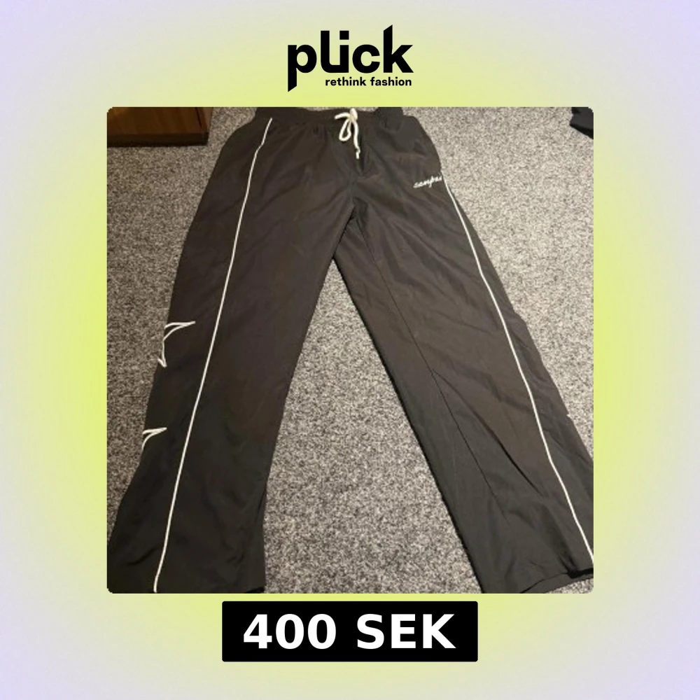 Svarta byxor från Campus med vita stjärnor broderade längs benen och vita ränder på sidorna. Byxorna har snörning i midjan och är tillverkade i ett mjukt syntetmaterial. Perfekt för dig som gillar en chill och unik stil.