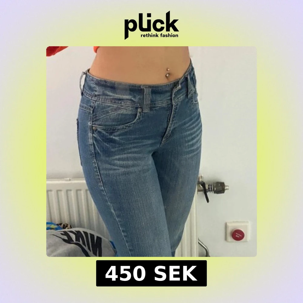 Säljer ett par klassiska blå bootcut jeans i jätte bra skick med snygga slitningar och kontrastsömmar.låg midja oxh sitter jätte bra. Vet ej exakta storlek men passar S-M, köptes från secund hand butik i Milano. För mer info bara skicka💗