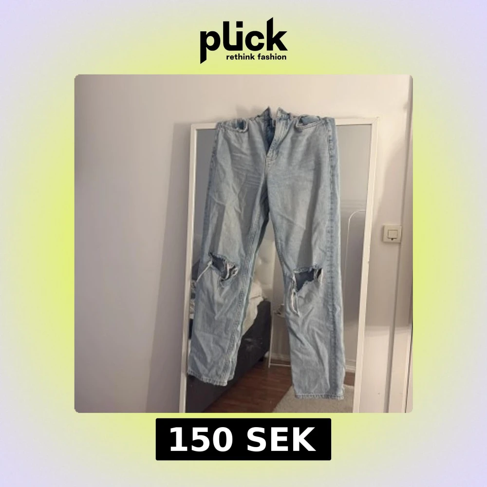 Säljer ett par ljusblå jeans med raka ben och stora slitningar vid knäna. Storlek S/M