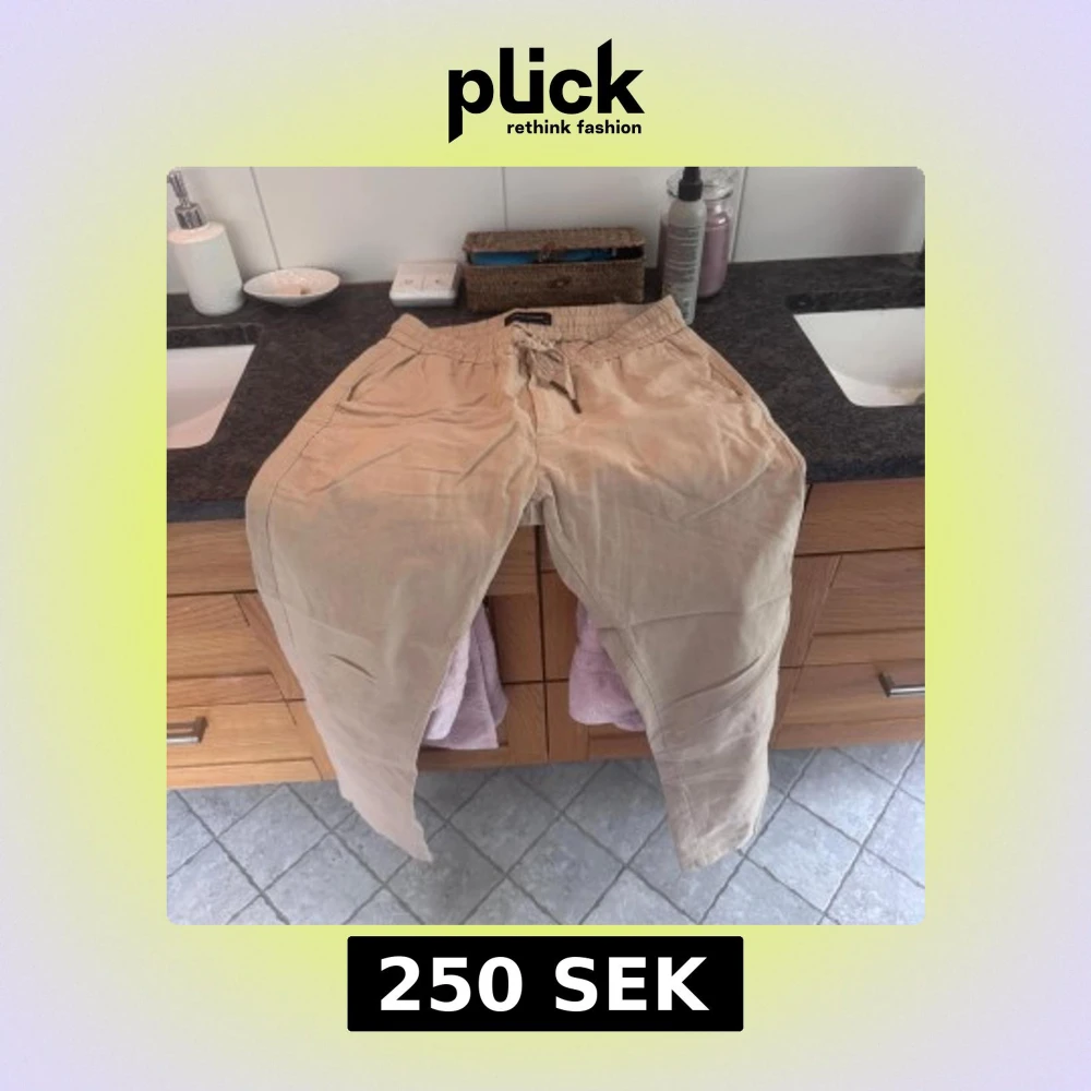 Snygga beiga linnebyxor med avslappnad passform och elastisk midja med snörning. Perfekta för en chill och stilren look. Lätta och luftiga, passar grymt till sommaren eller våren.