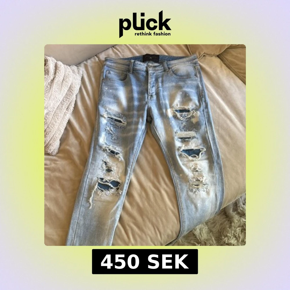 Säljer ett par ljusblå jeans från Younger Sons med rejält slitna och trasiga detaljer framtill. Jeansen har klassisk femficksdesign, slim fit och är tillverkade i bomull. Perfekta för dig som gillar en edgy streetstil. Knappt använda då ja inte hade behov av dem.