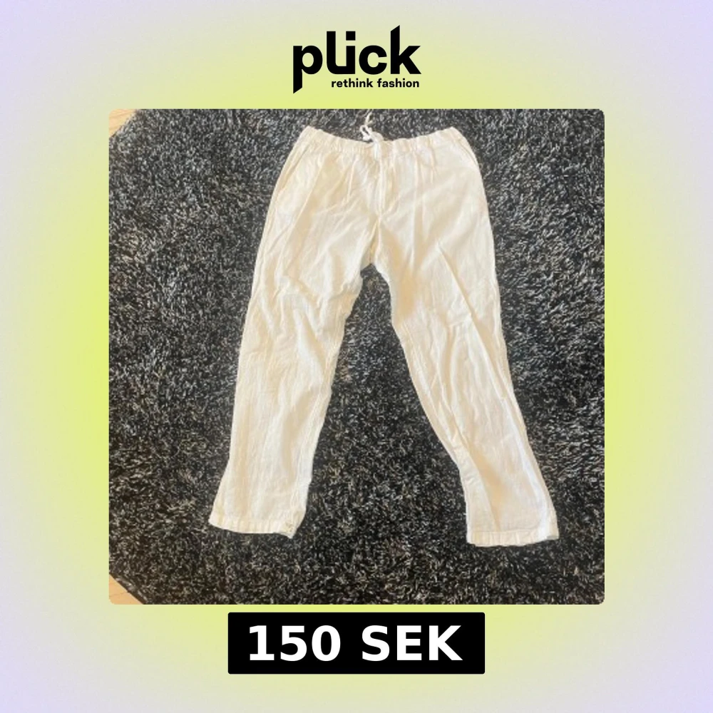 Säljer ett par bekväma beige linnebyxor med elastisk midja och snörning. Perfekta för en avslappnad stil. Byxorna har en loose passform och är tillverkade i ett lätt och luftigt material. Storlek m liten i storlek