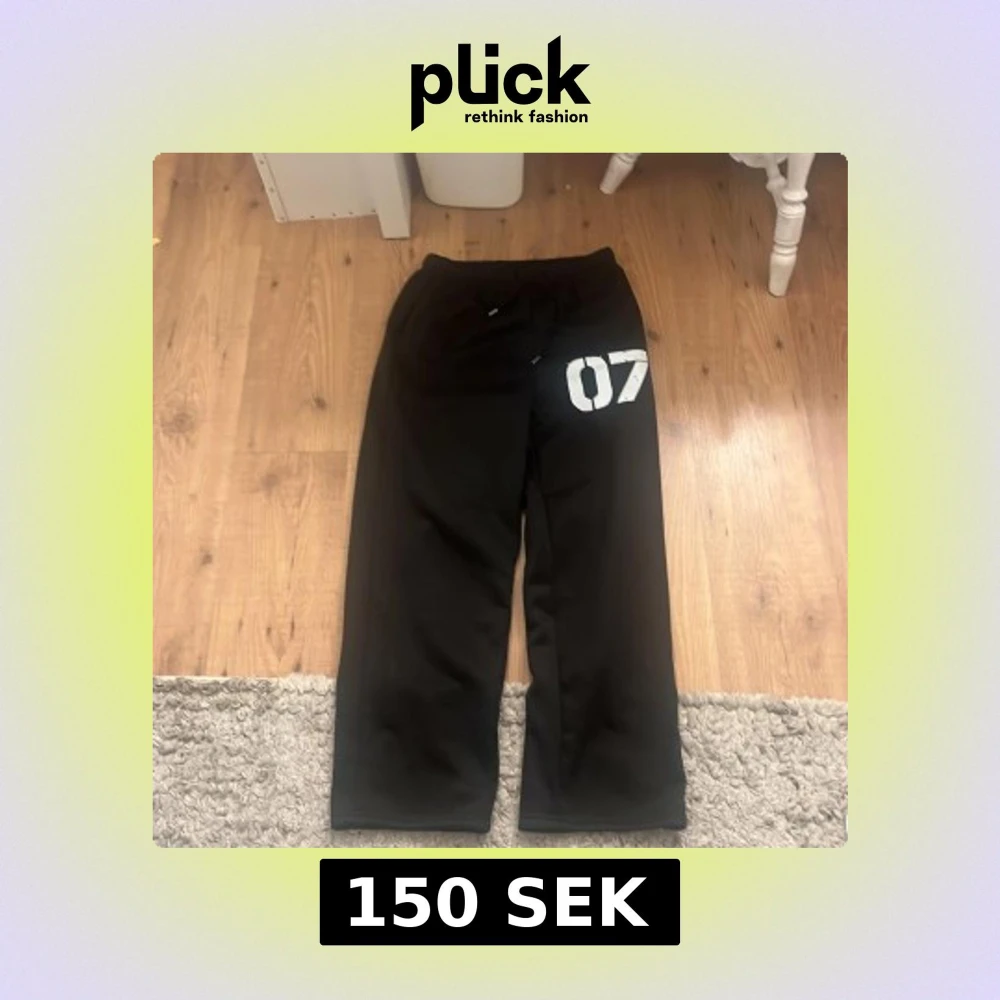 Svarta mjukisbyxor med vitt tryck '07' på ena benet och snörning i midjan. Byxorna har en rak passform och är gjorda i mjukt material, perfekta för chill eller träning. Jag vet inte riktigt vart de är ifrån då hag fick de av en kompis och lappen var bortklippt. De har ibte kommit till användning och inte av min kompis eller så i väldigt bra skick.