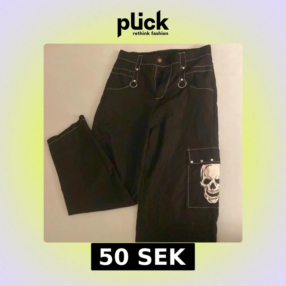 Unika svarta cargopants med vit kontrastsöm och stora fickor. Ena benet har ett fett dödskalletryck och nitar på ficklocket. Byxorna har D-ringar i midjan för extra edge och är tillverkade i ett mjukt bomullsliknande material. Perfekta för dig som gillar alternativ stil. Tunnt luftigt material som är väldigt skönt för sommaren.