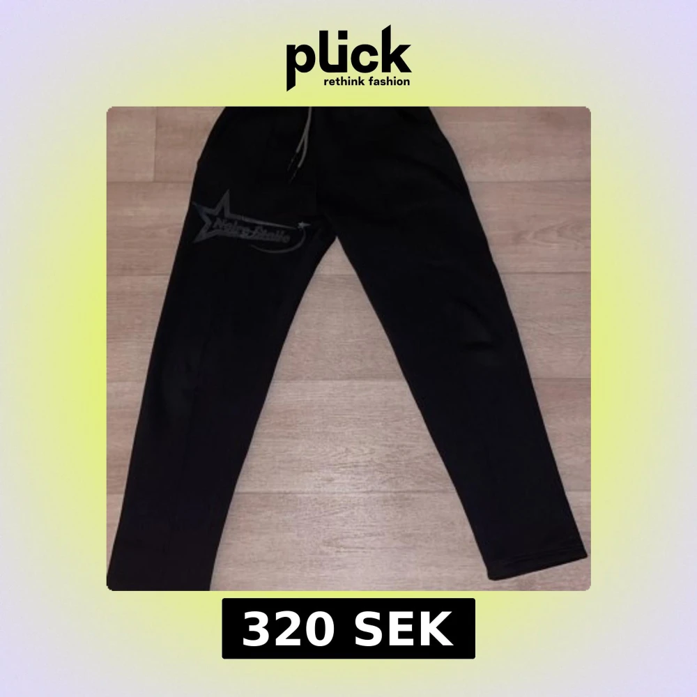 Svarta mjukisbyxor med dragsko i midjan och en stor stjärnformad tryckdetalj på ena benet. Byxorna har en bakficka och är perfekta för en avslappnad stil. Finns i storlekar S, M och L.