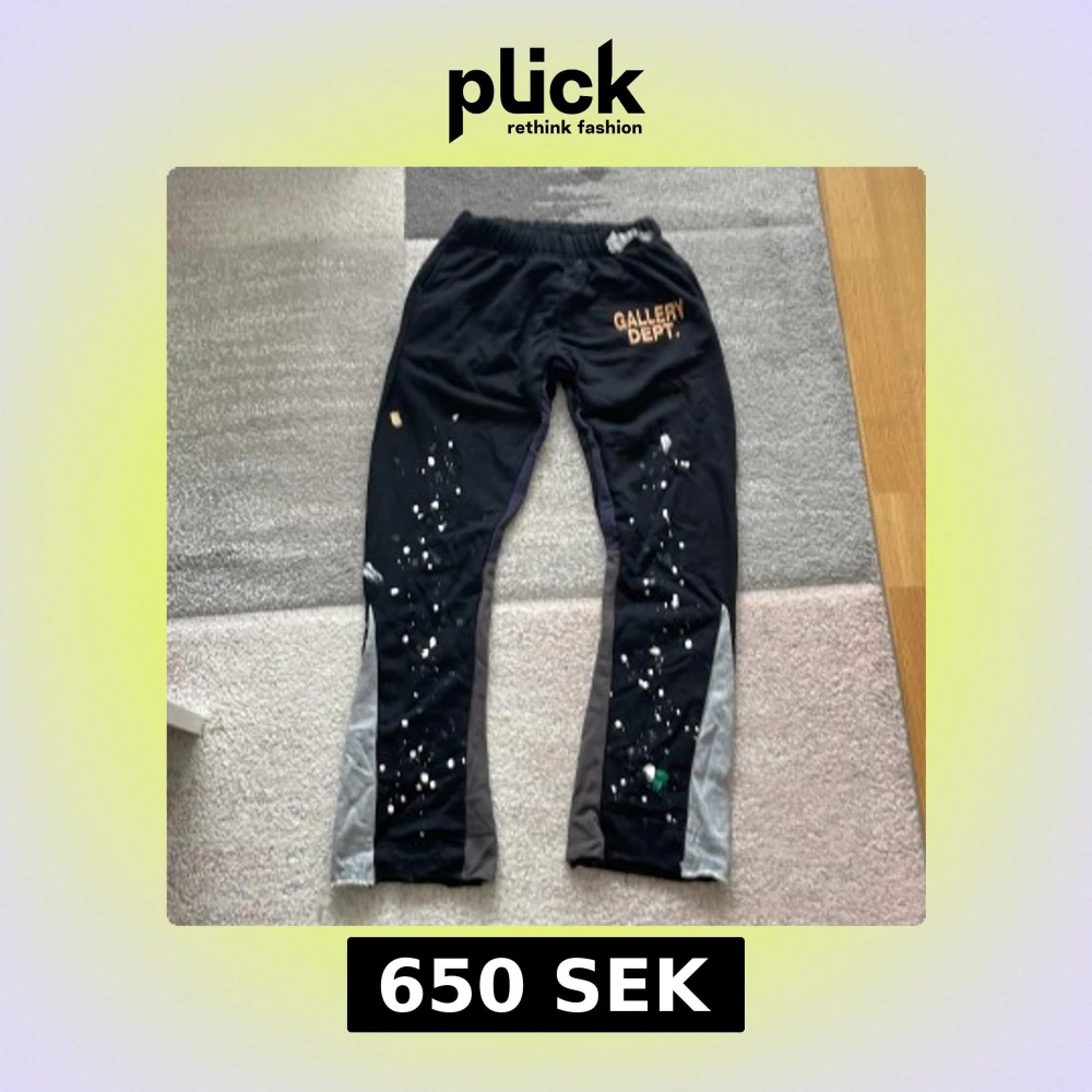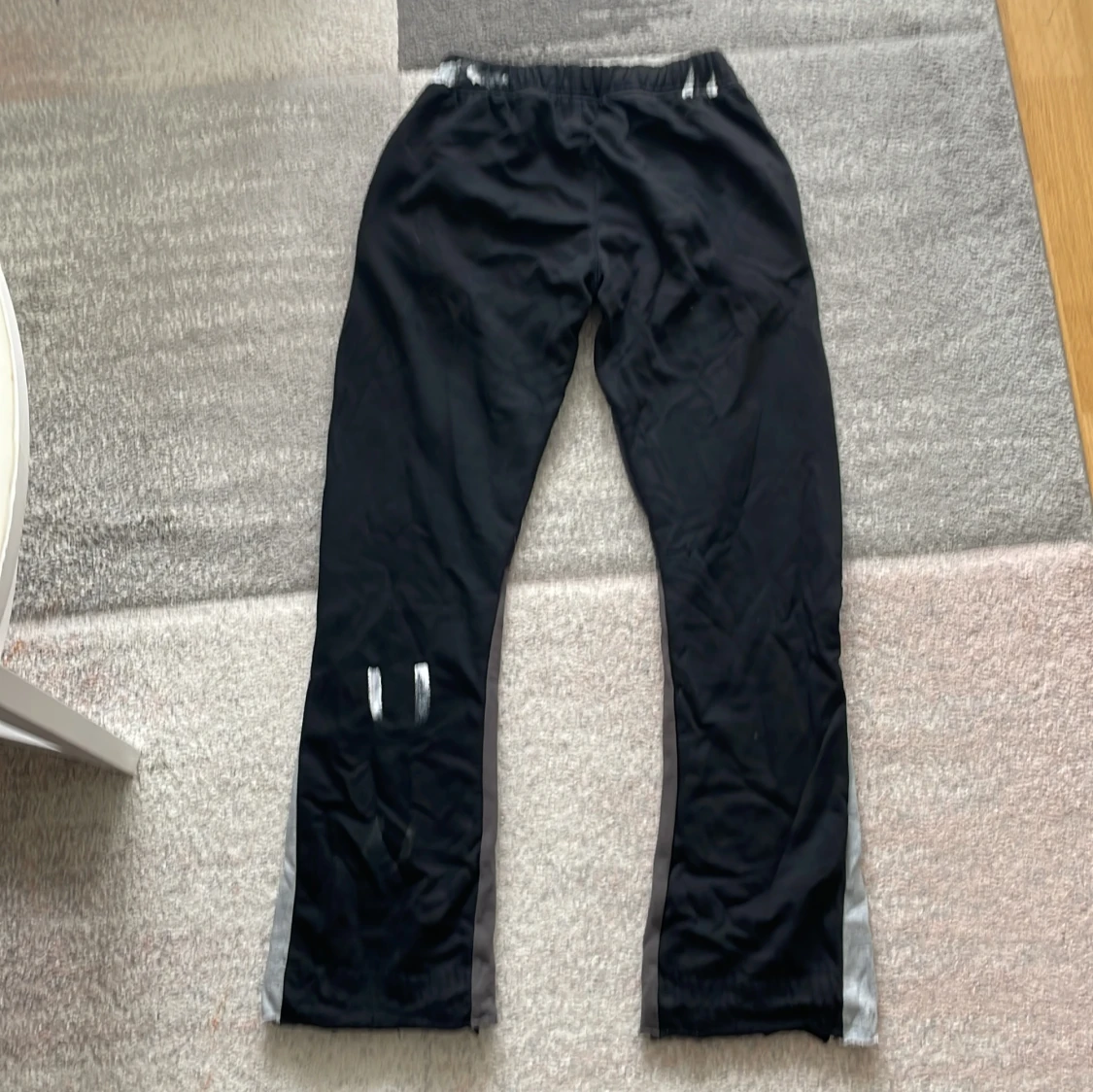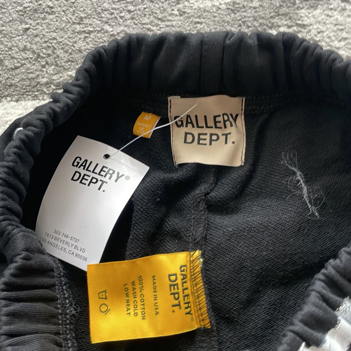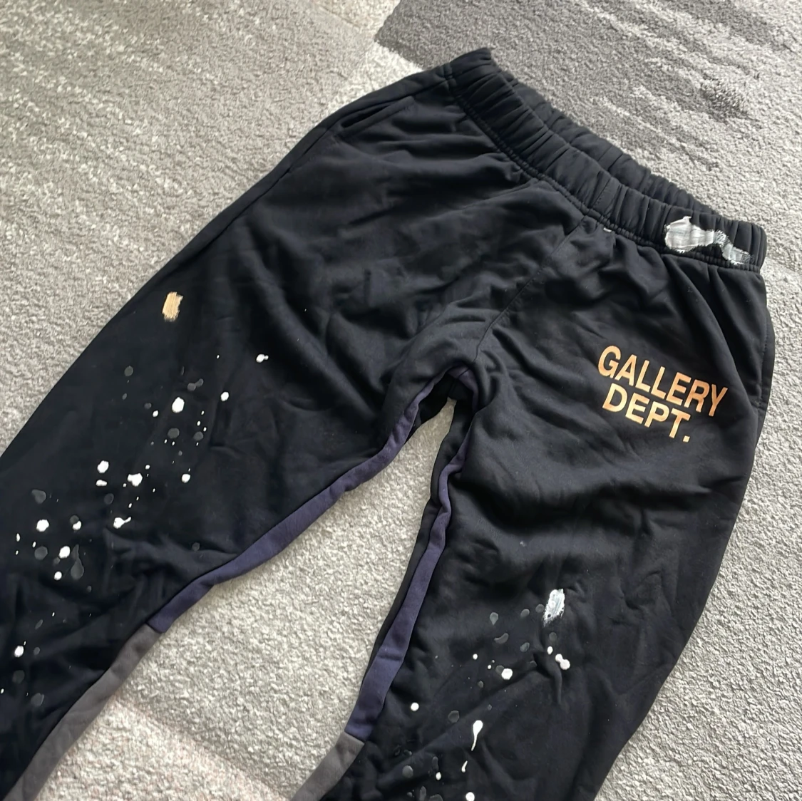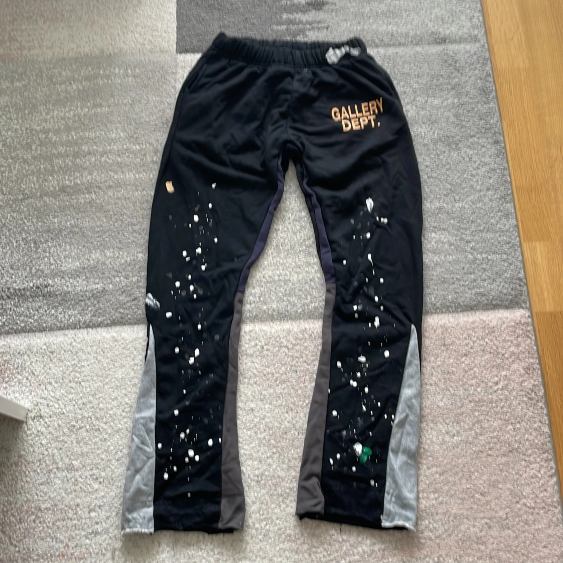 Svarta mjukisbyxor från Gallery Dept. med elastisk midja, färgstänk och tryckt logga på ena benet. Byxorna har grå och mörkgrå paneler längs sidorna och är tillverkade i 100% bomull. Snygg streetstil med unik färgdetalj.