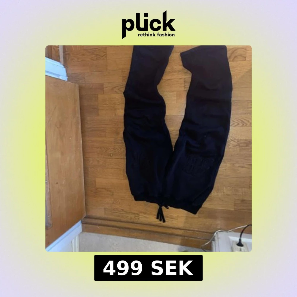 Svarta mjukisbyxor med broderade bokstäver på framsidan. Byxorna har en bekväm passform och dragsko i midjan för justerbarhet. Perfekta för en avslappnad stil.
