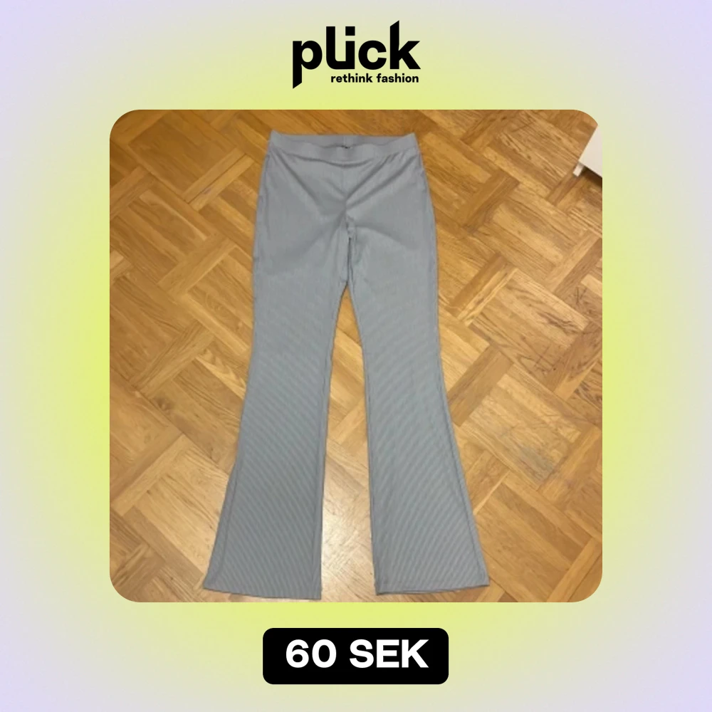 Säljer ett par grå randiga byxor från H&M Divided i storlek M. Byxorna är högmidjade och har en bootcut-stil som ger en snygg siluett. De är tillverkade i polyester vilket gör dem bekväma och stretchiga. Perfekta för både vardag och fest! Aldrig använt då byxorna är för stora. Köparen står för frakten!