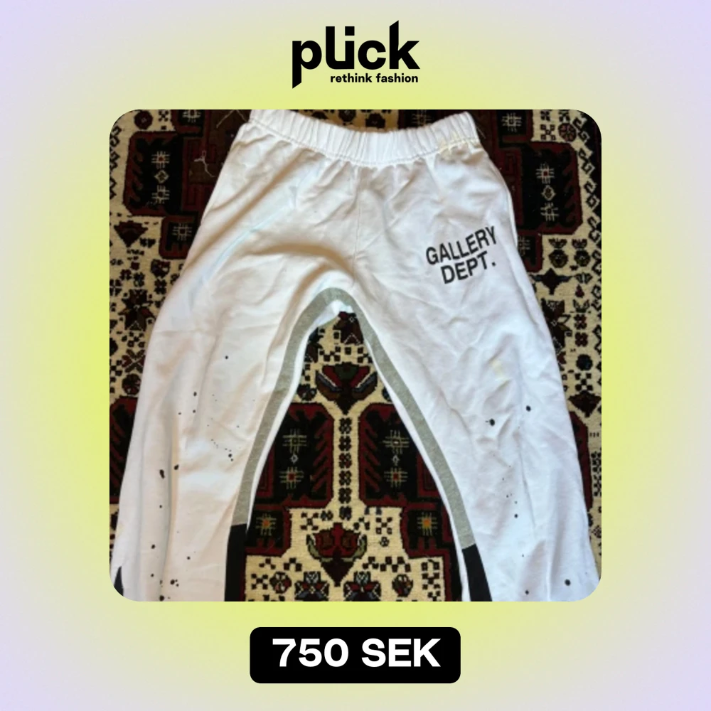 Säljer ett par snygga Gallery Dept Byxor för jättebra pris. Skicket är bra men det finns en liten gul fläck på framsidan som knappt syns. Har använt dem ett par gånger därför är skicket 9/10