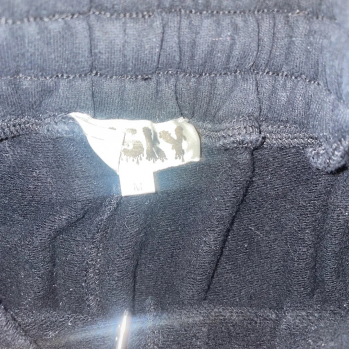 Svarta mjukisbyxor från SRY i storlek M. Byxorna har en elastisk midja med snörning och en grå patch med motiv på vänster lår. Perfekta för chill dagar eller när du vill ha det bekvämt. Mjukt material och avslappnad passform.