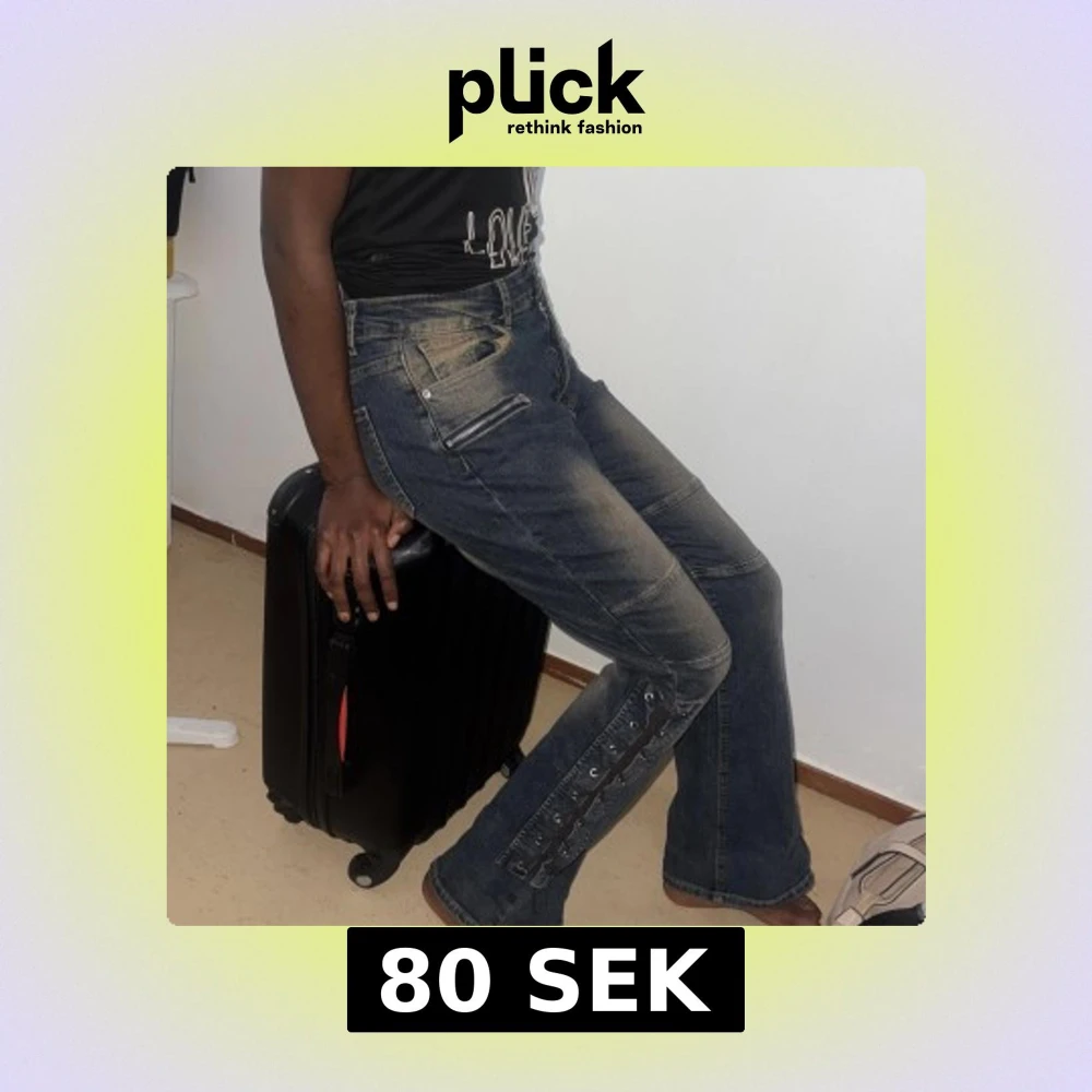 Säljer ett par mörkblå jeans med coola slitningar, snörningsdetaljer längs benen och dragkedjor vid fickorna. Byxorna har hög midja och bootcut-modell som ger en snygg siluett. Perfekta för dig som vill sticka ut med din stil.