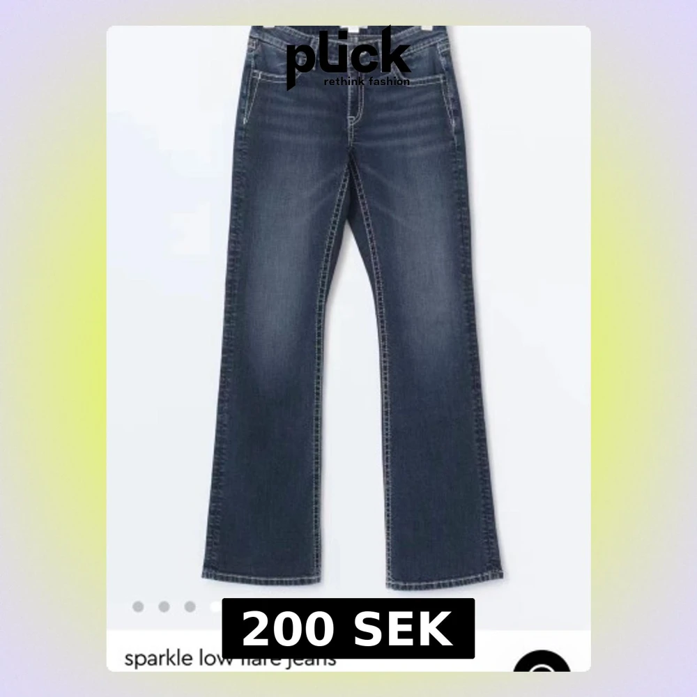 Snygga blå jeans med låg midja och flare-ben. Baktill finns broderade fickor med glittriga detaljer som ger extra attityd. Jeansen har klassisk femficksdesign och kontrastsömmar. Perfekta för dig som vill sticka ut lite extra.