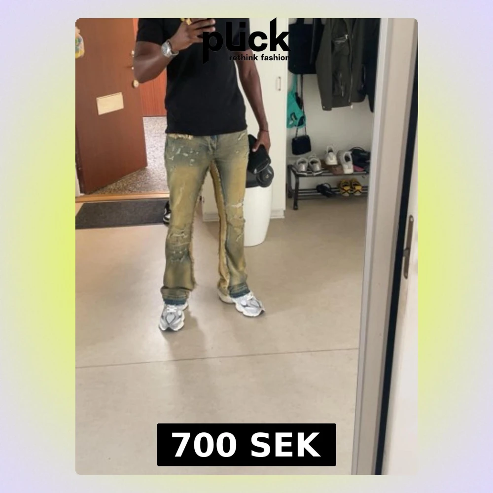Säljer ett par ljusbruna jeans med tydliga slitningar och råa kanter längs benen. Byxorna har en baggy passform och är tillverkade i jeansmaterial. De har en cool, sliten look som passar dig som gillar streetstyle och vill sticka ut. Är 184 cm