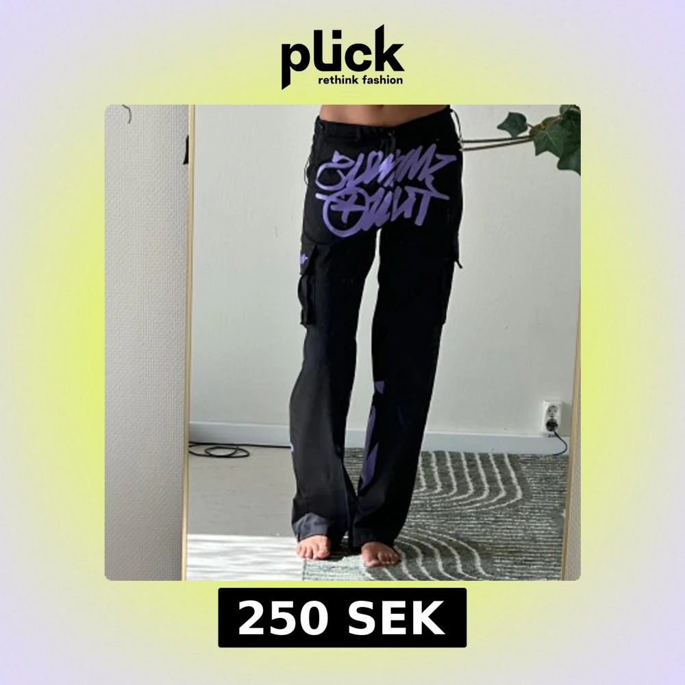 Säljer ett par svarta cargobyxor med stora lila tryck och grafiska detaljer. Byxorna har vida ben och flera fickor på sidorna. Perfekta för dig som gillar streetwear och vill sticka ut med coola detaljer.