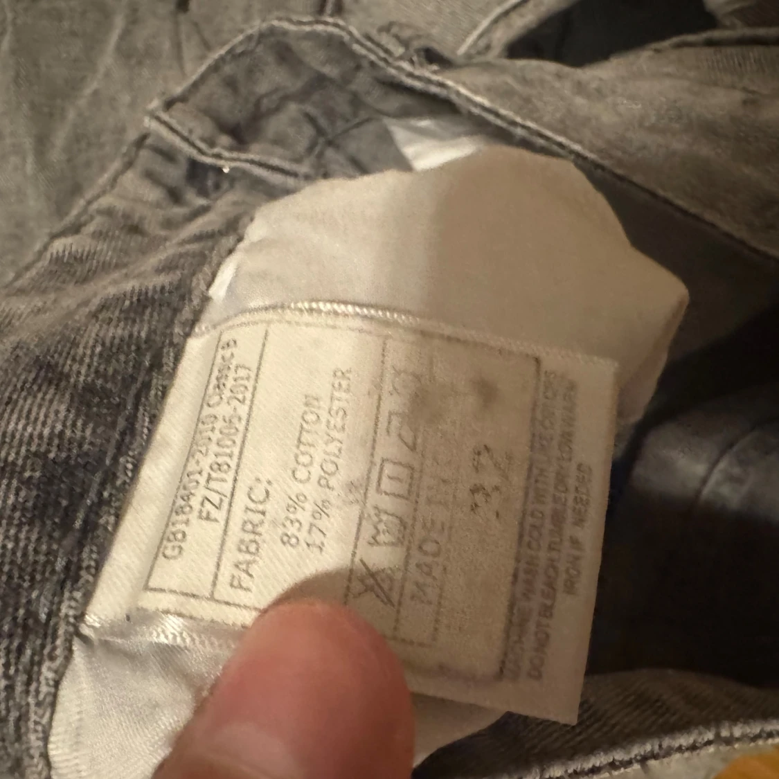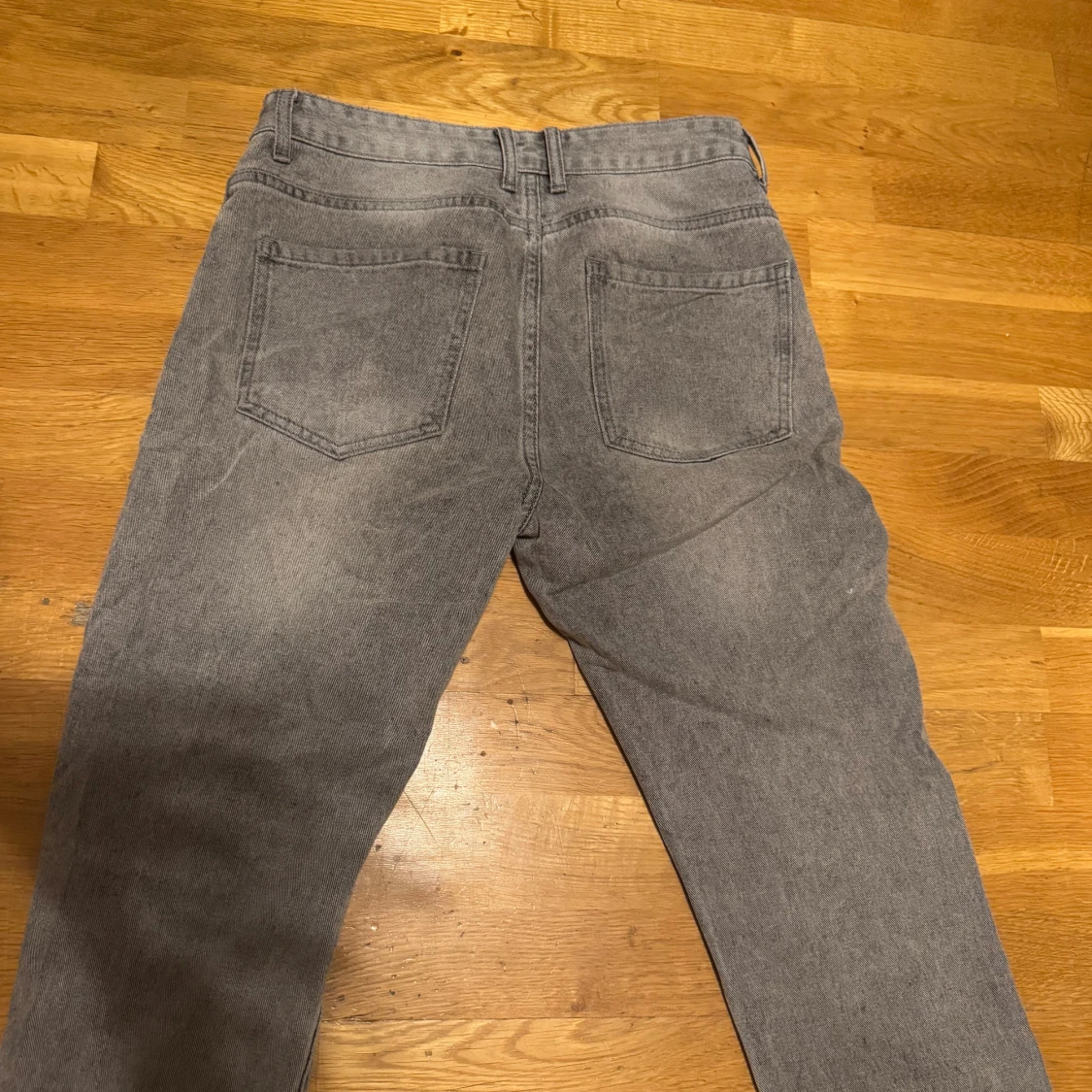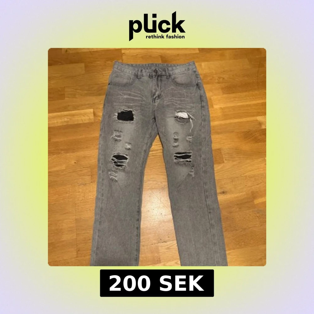 Säljer ett par grå jeans med flera slitningar och hål framtill för en riktigt edgy look. Byxorna har klassisk femficksdesign och raka ben. Materialet är 83% bomull och 17% polyester, vilket gör dem både mjuka och slitstarka. Perfekta för dig som gillar streetstyle.