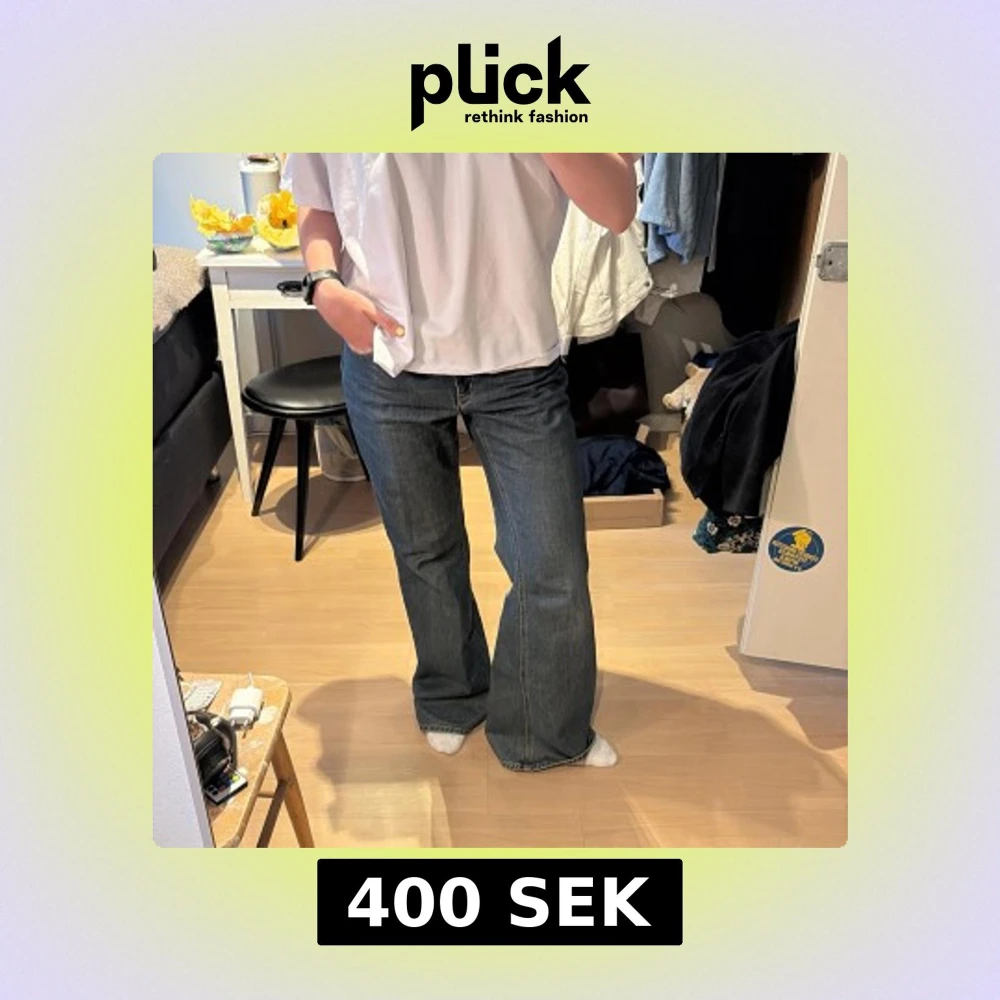 Säljer ett par blå bootcut jeans med snygga nitar på bakfickorna. Jeansen har normal passform och klassisk femficksdesign. Perfekta för dig som vill ha en cool och avslappnad stil.