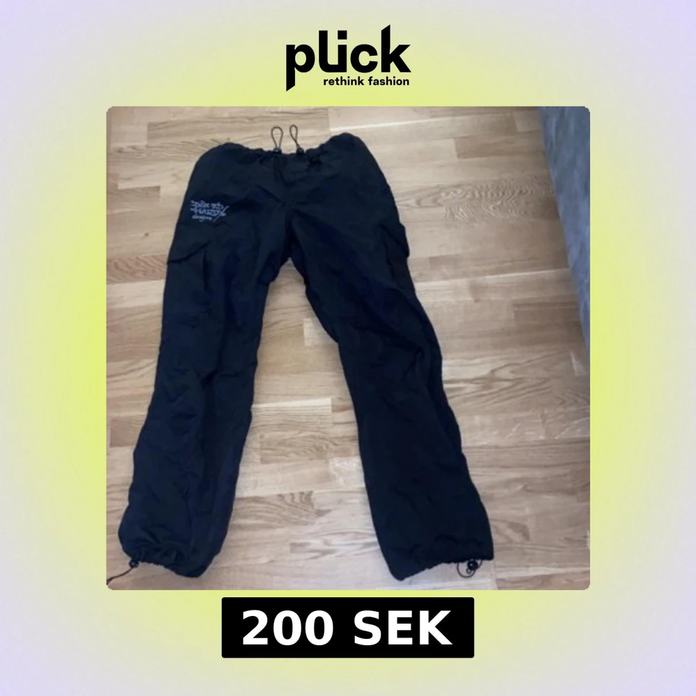 Svarta låg midjade byxor från Ed Hardy x Urban Outfitters i storlek M. Byxorna har dragsko i midjan och vid benslut, samt ett stort broderat motiv på ena benet och Ed Hardy-logga bak. Köpta i Dubai med prislapp kvar köpte för 1055kr men säljer för 350 pris kan diskuteras Storlek m = 38