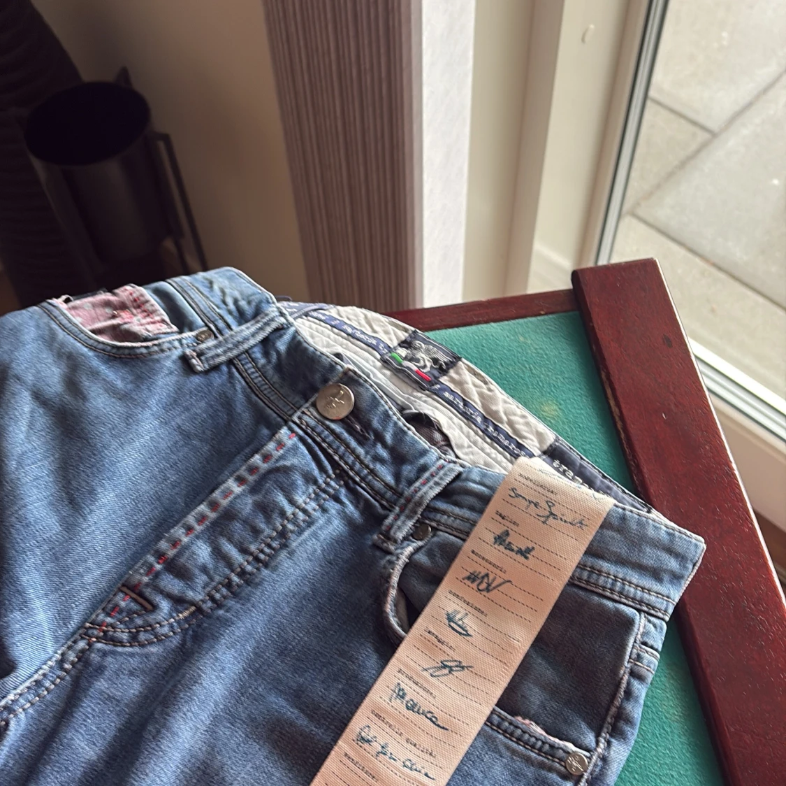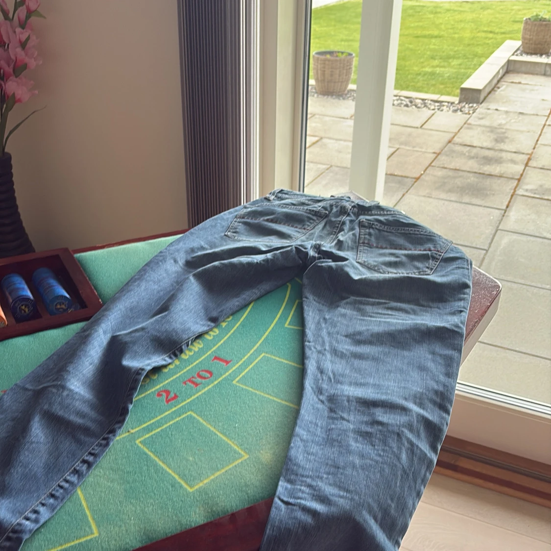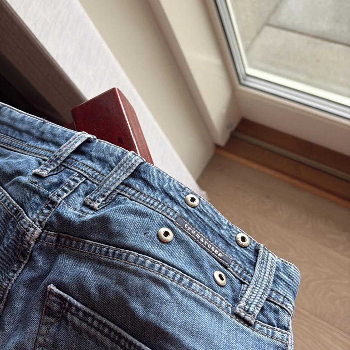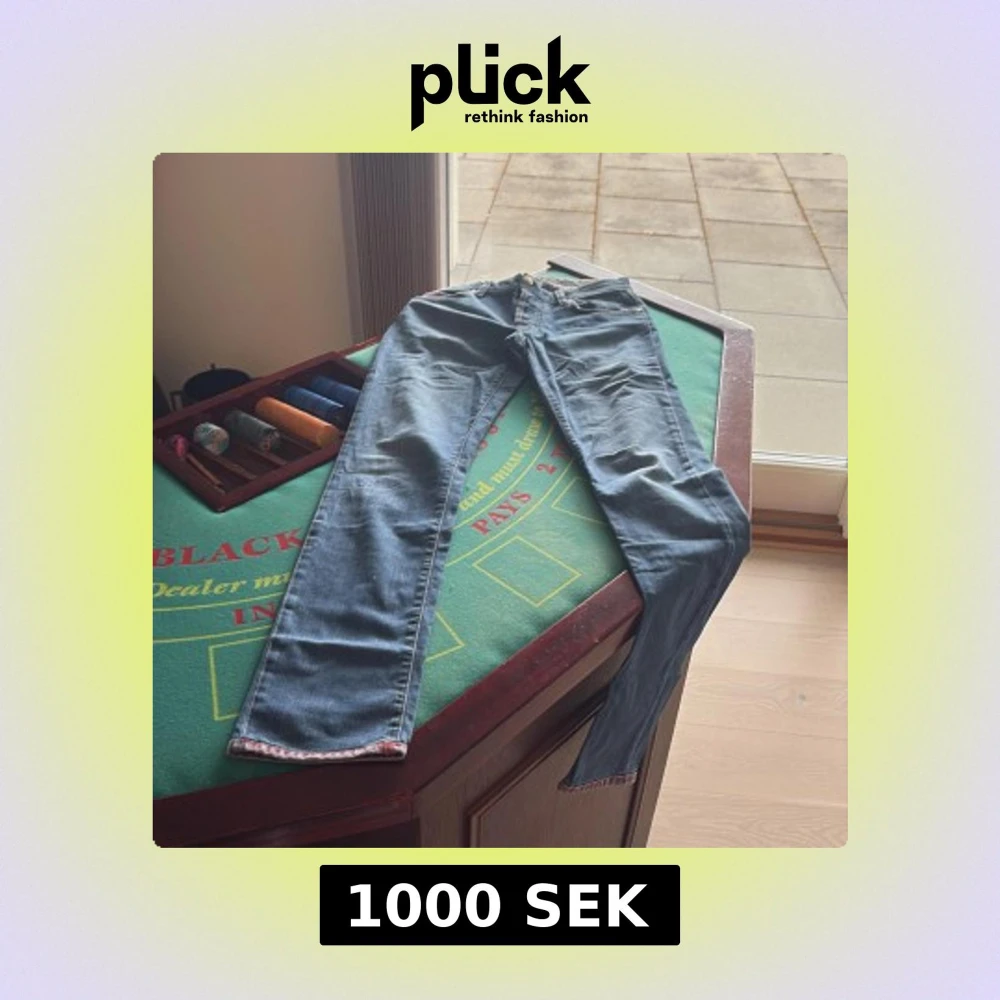 Säljer ett par klassiska blå jeans med raka ben från tramarossa väldigt snygga och passar perfekt, size 31 jag är 177 och dom är lite för långa