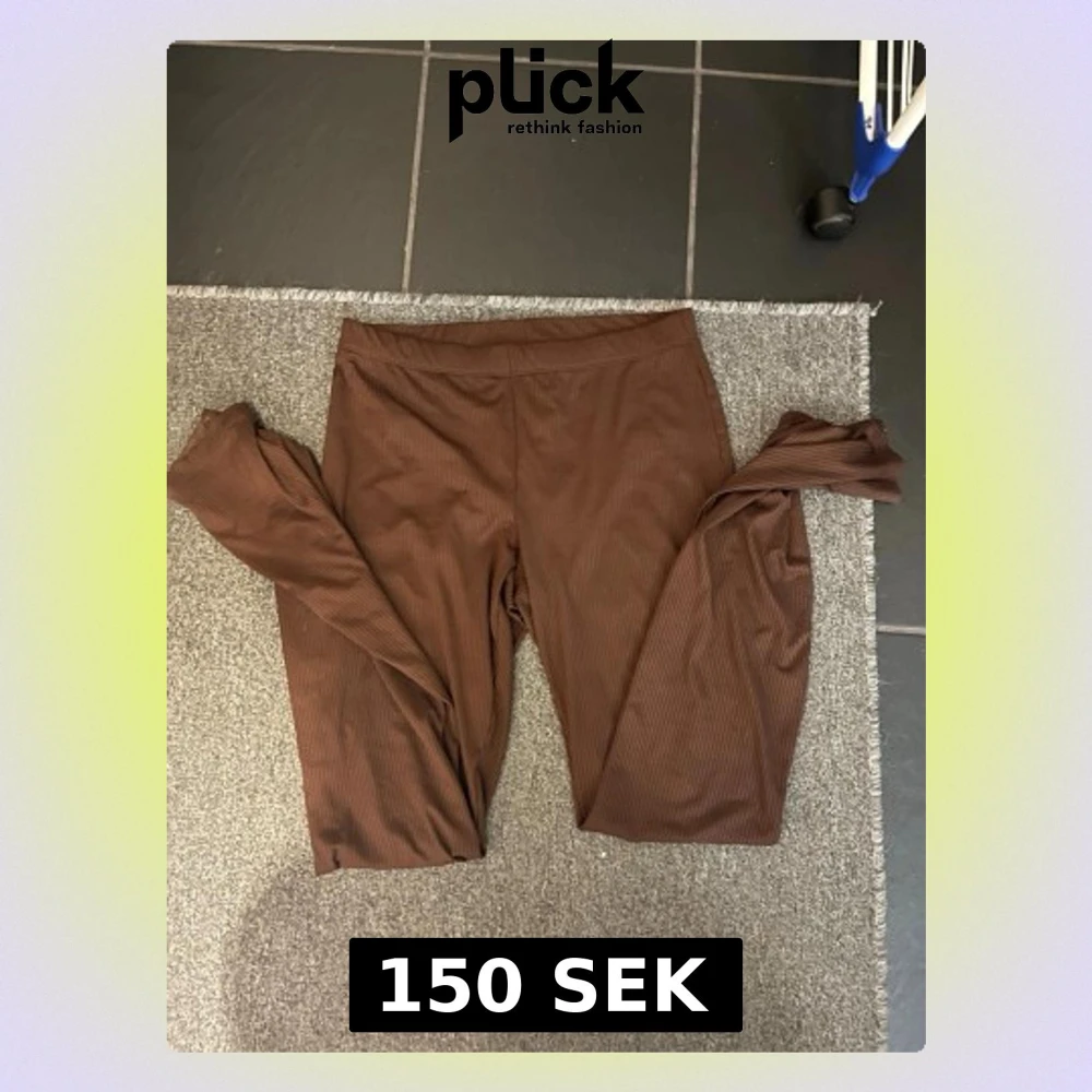 Säljer ett par bruna leggings med ribbad struktur. De har en enkel design med elastisk midja och är gjorda i ett mjukt och stretchigt material som sitter skönt mot kroppen. Perfekta för en chill och avslappnad stil.