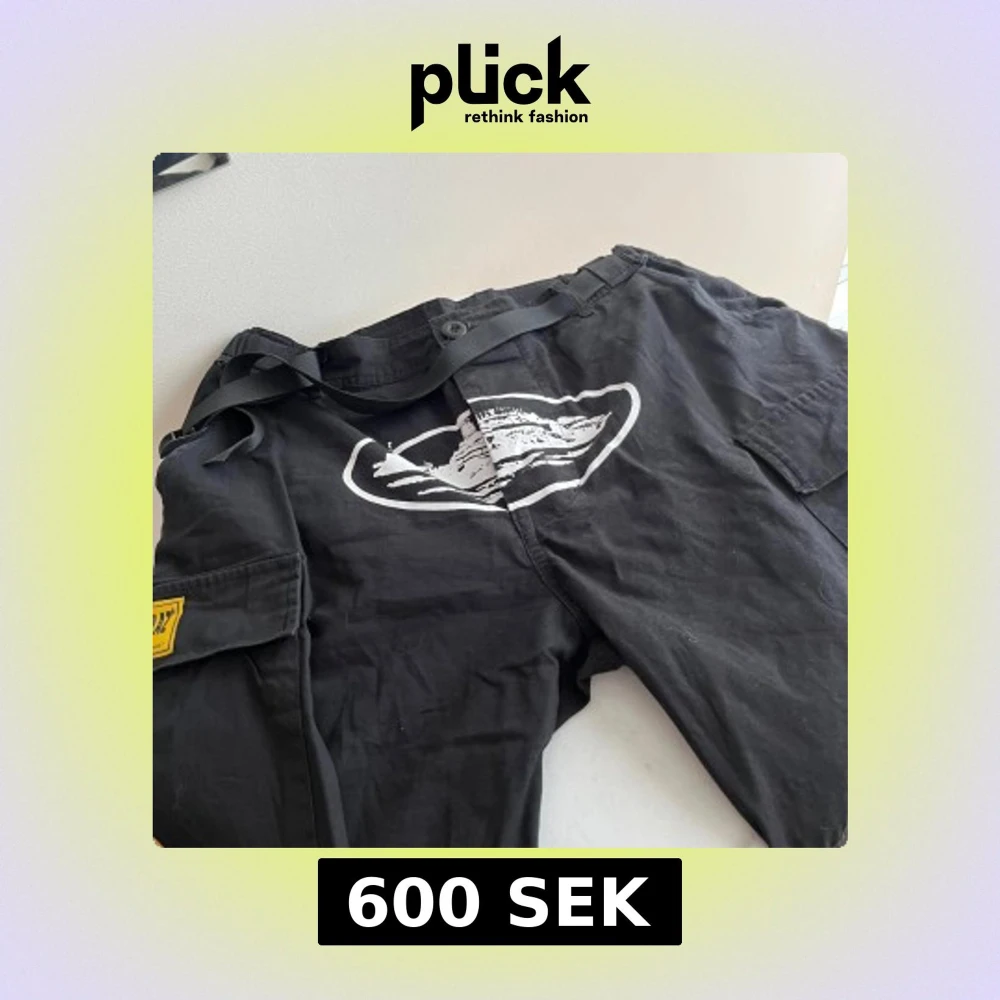 Säljer ett par svarta cargopants med coolt tryck på framsidan. Byxorna har flera praktiska fickor och en justerbar midja med bälte. Perfekta för en avslappnad stil.