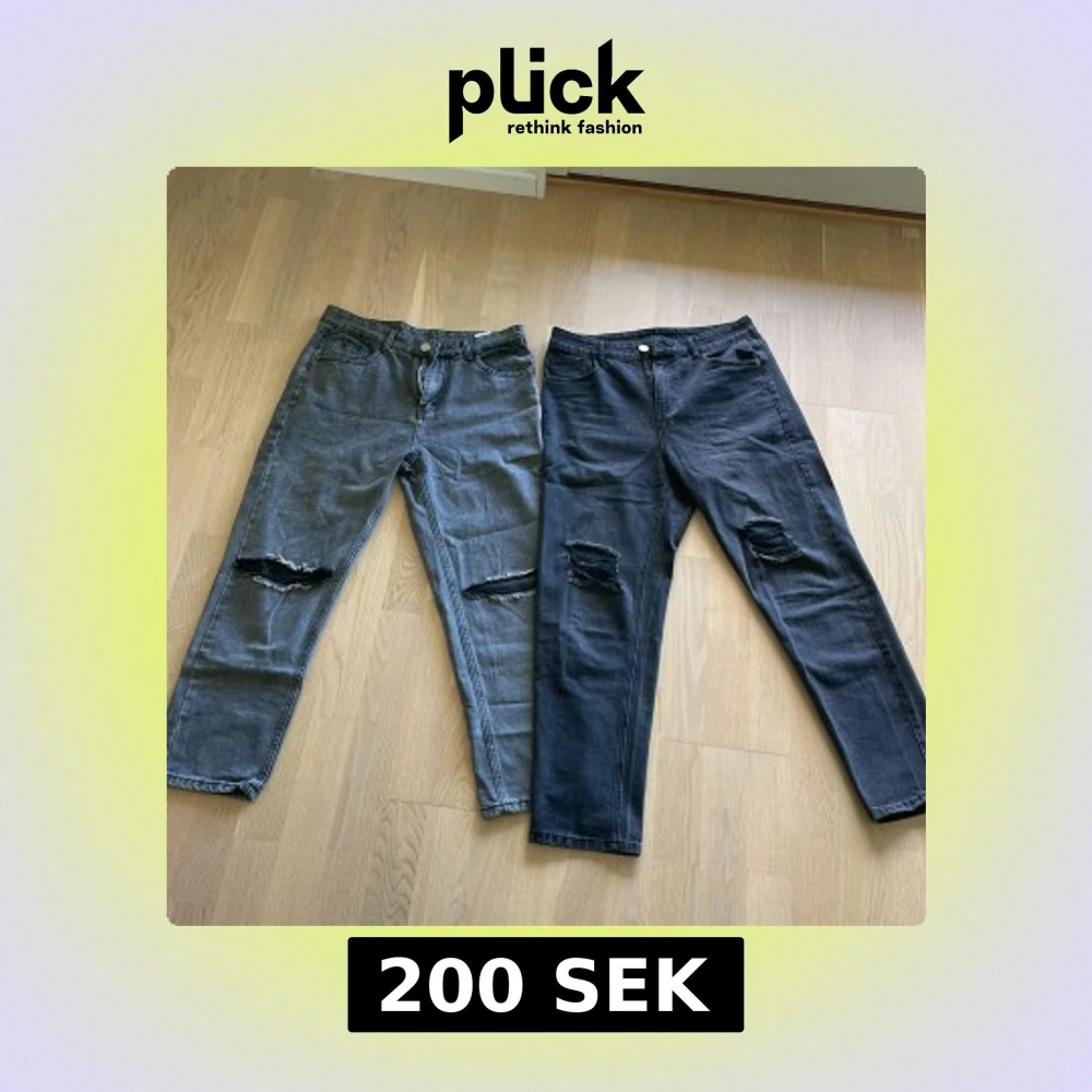 Säljer två par raka jeans, ett i grått och ett i svart, båda med produktionsgjorda slitningar över knäna. Klassisk femficksmodell med knapp och dragkedja. Perfekta för en avslappnad och trendig look. Går även att bara köpa ett par om man är sugen (100 kr styck)