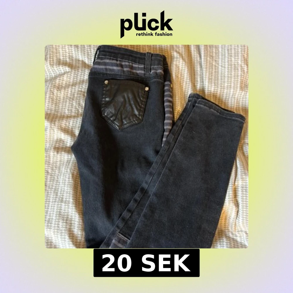 Unika svarta jeans med gråa ränder, detaljer i fejkskinn på fickor och lår samt flera dragkedjor på ena benet. Snygg mix av material och cool streetstil. Perfekta för dig som vill sticka ut med din outfit.