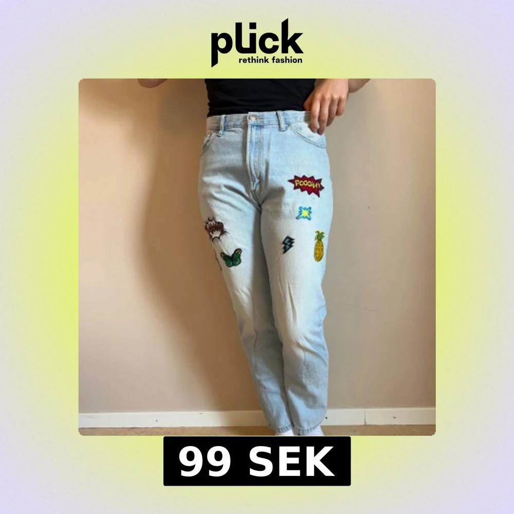 Ljusblå jeans i denim med patches. Rak passform. Två av patchesarna sitter inte på men de skickas med. Går att fästa med lim eller att sy fast