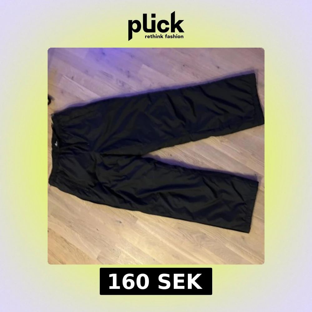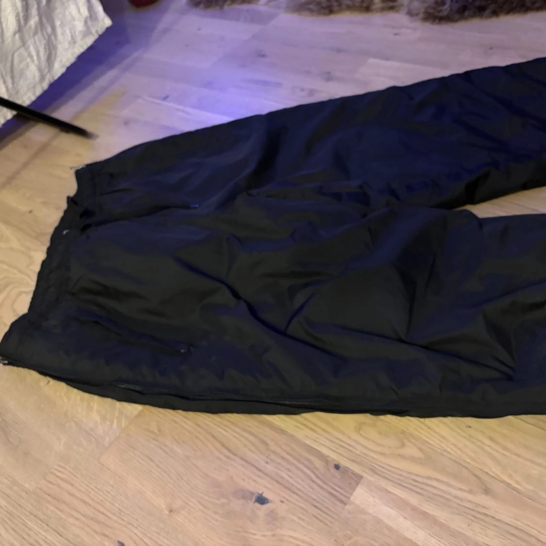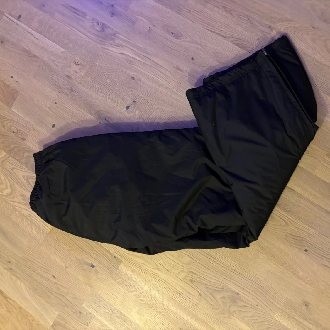 Svarta täckbyxor med bred passform och elastisk midja. Byxorna har dragkedja vid bensluten och är tillverkade i ett slitstarkt syntetmaterial som håller dig varm under kalla dagar. Perfekta för vinteraktiviteter och har en enkel, clean look.