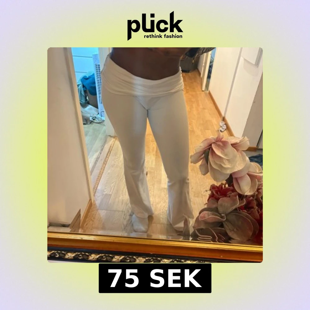 Säljer ett par vita bootcut byxor med låg midja och snygg omlott-detalj.