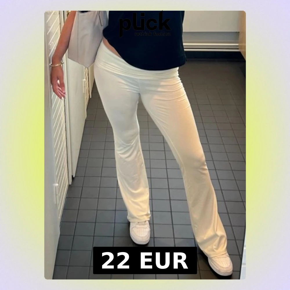 Säljer ett par vita bootcut byxor med låg midja. Byxorna är gjorda i ett mjukt och stretchigt material som sitter skönt och följer kroppen. Perfekta för en avslappnad men ändå snygg look. Passar till sneakers eller sandaler.