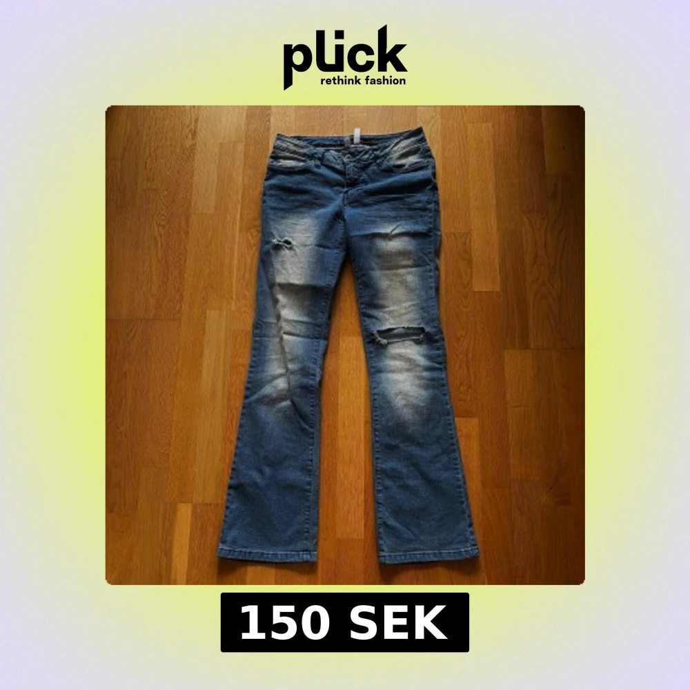 Säljer ett par blå bootcut jeans från Rainbow med slitningar och hål på båda benen. Jeansen har låg midja.