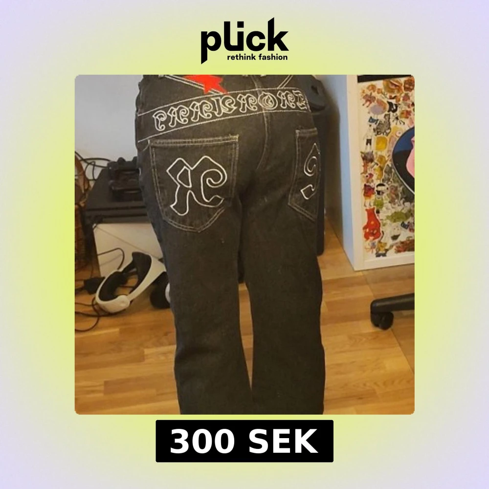 Unika svarta jeans med broderad text och mönster på bakfickorna. De har en röd stjärna på framsidan och baksidan🙏😻