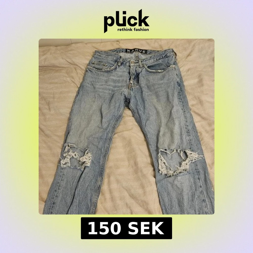 Ljusblå jeans från Karve med raka ben och stora slitningar vid knäna för en riktigt edgy look. Klassisk femficksmodell med dragkedja och knapp. Perfekta för dig som gillar streetstyle och vill sticka ut.