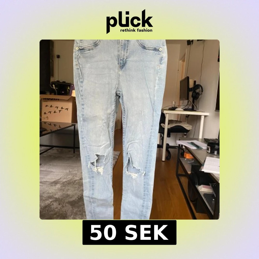 Säljer ett par ljusblå jeans med slitningar och hål på båda knäna. Klassisk femficksmodell med raka ben och normal passform. Perfekta för en avslappnad och trendig look.