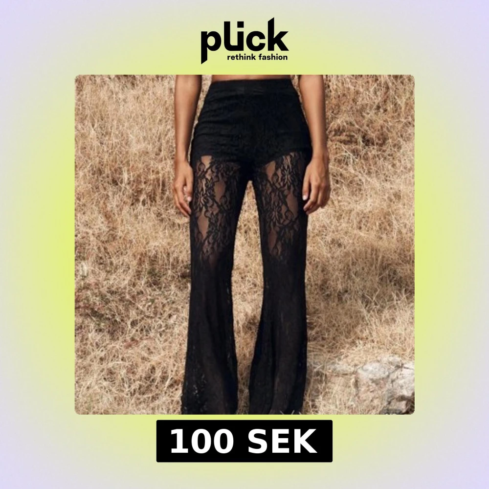 Säljer ett par svarta, transparenta spetsbyxor från SHEIN. Byxorna är högmidjade med utsvängda ben och har ett vackert blommigt spetsmönster. Inte använda bara testade💖