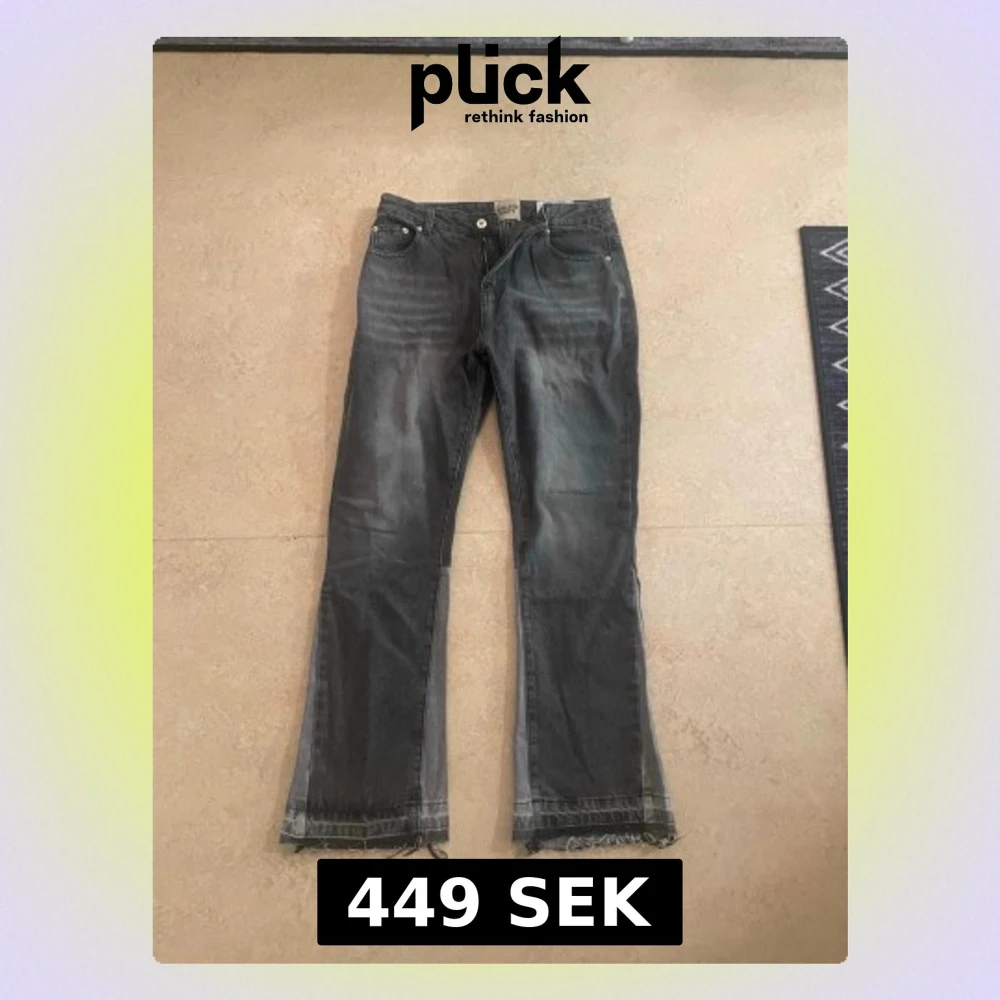 Säljer ett par svarta jeans från Gallery Dept med bootcut-snitt och råa, fransiga kanter vid bensluten. Jeansen har en tvättad look med ljusare partier och klassiska fem fickor. Materialet är jeans och de har en normal passform.