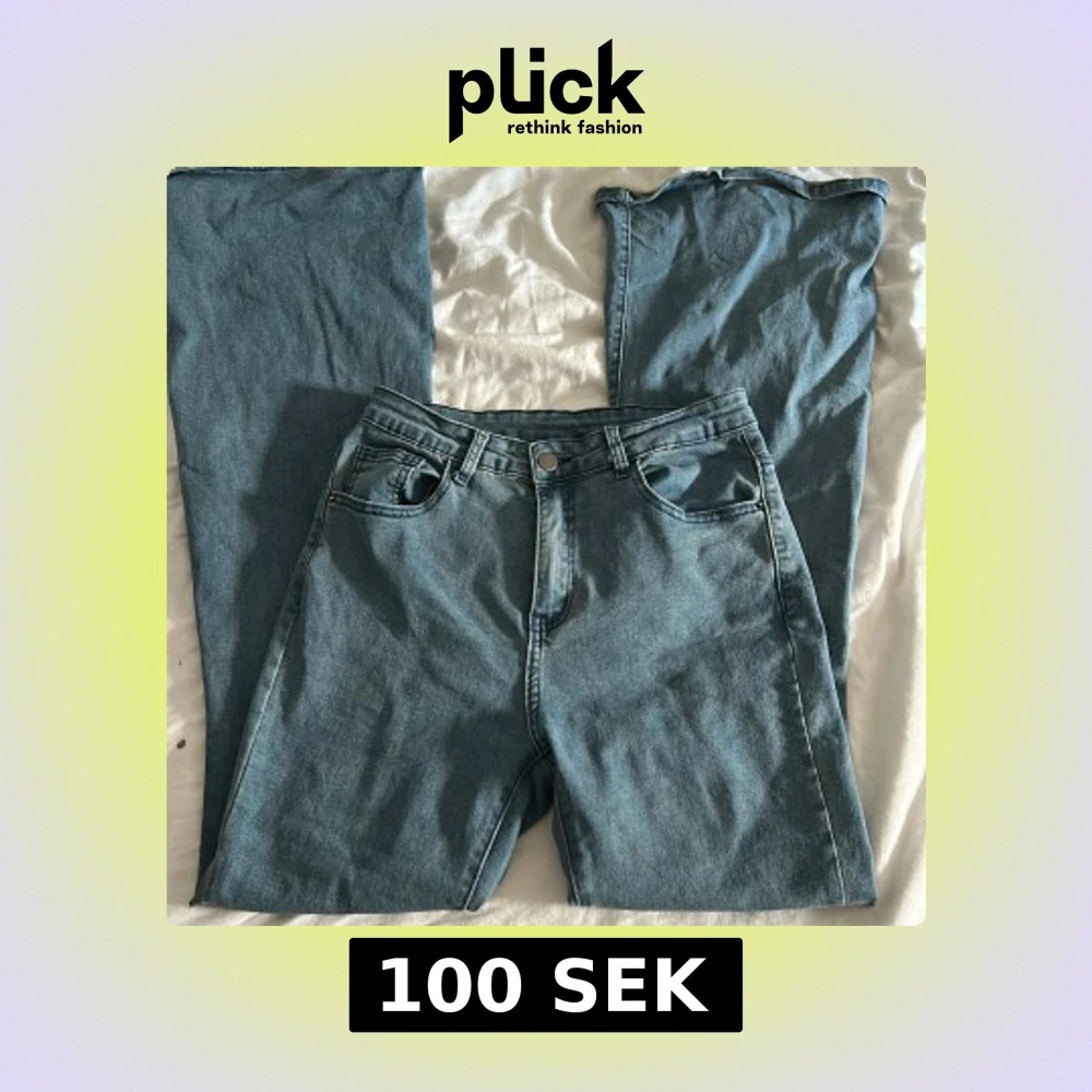 Säljer ett par ljusblå bootcut jeans från Shein i storlek M. Jeansen har klassisk femficksdesign, hög midja och är tillverkade i en mjuk denimblandning med polyester. Snygg passform som sitter tajt upptill och släpper ut vid benslutet.