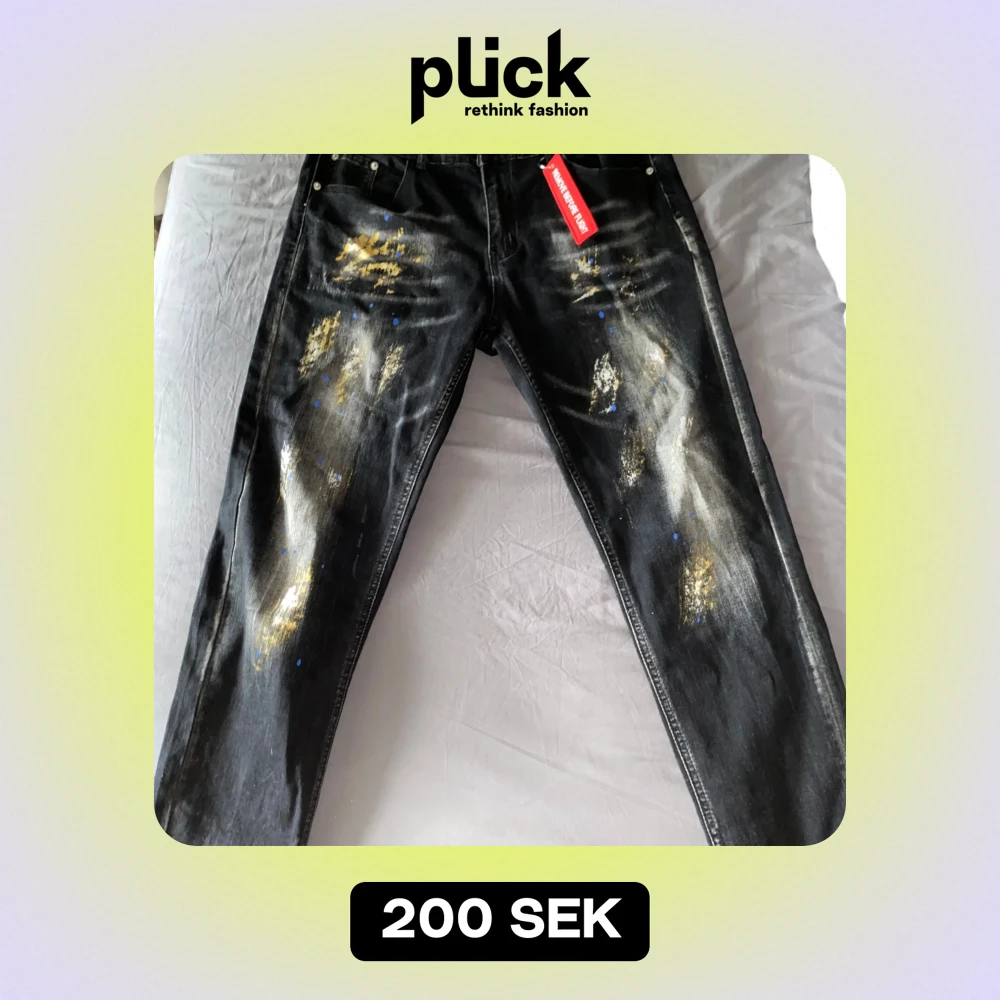 Coola svarta jeans med unika färgstänk i gult och blått. De har en sliten look med detaljer som ger en edgy stil. Perfekta för en avslappnad och trendig outfit. Passar bra till sneakers eller boots!