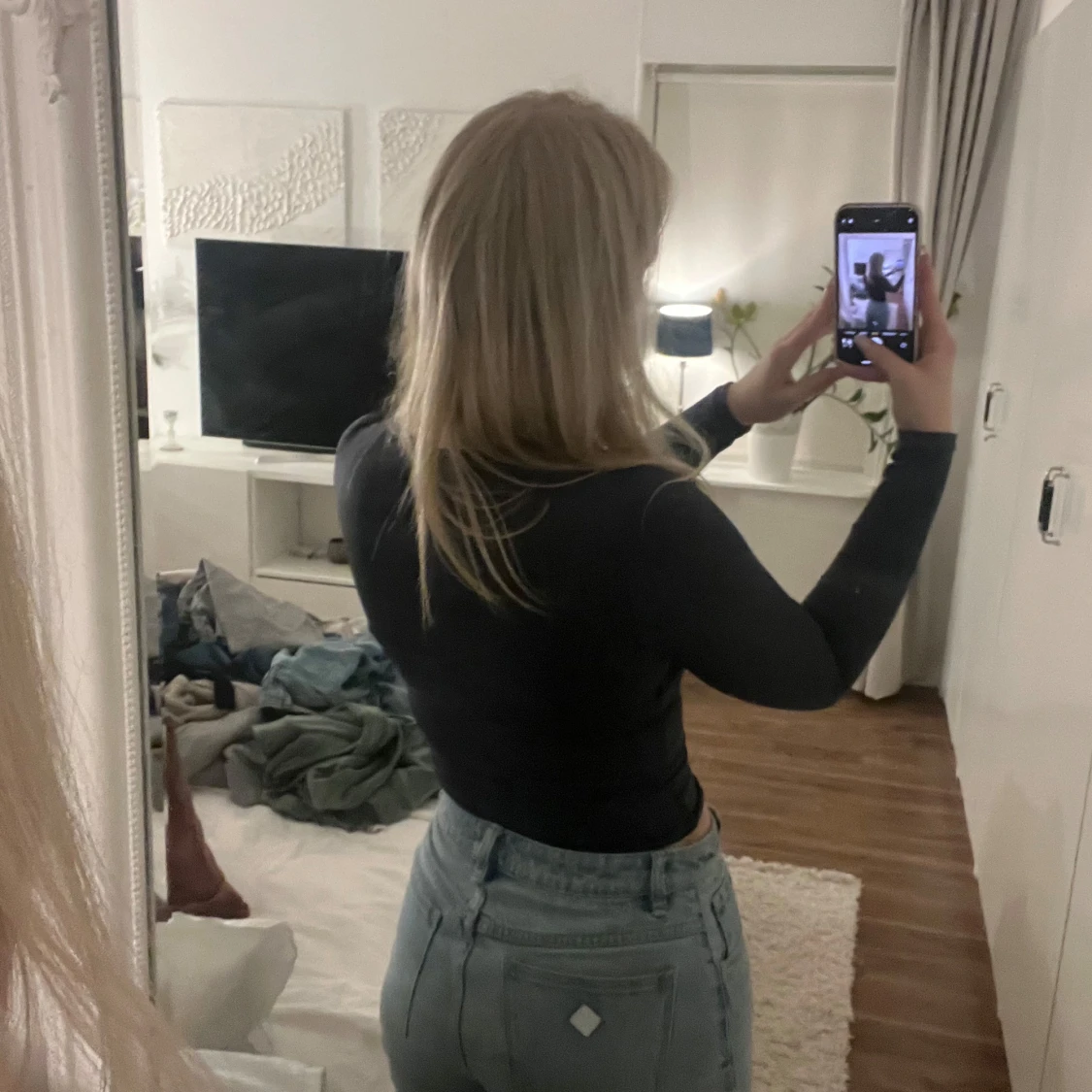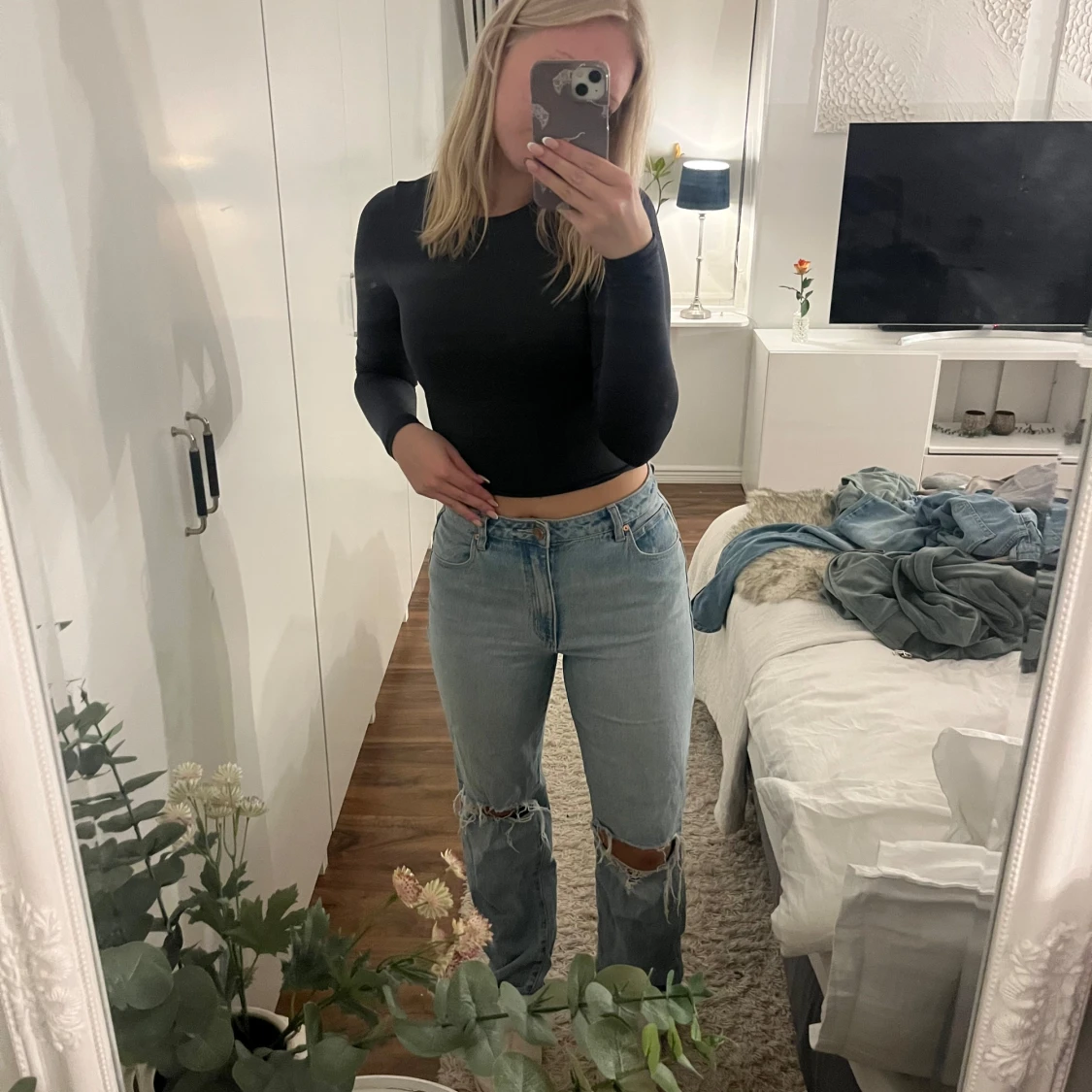 Säljer ett par klassiska ljusblå abrand jeans med raka ben och snygga slitningar vid knäna. Jeansen har hög midja och är tillverkade i äkta denim. Perfekta för en avslappnad och trendig look.