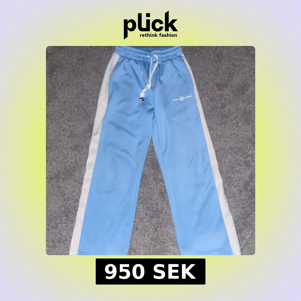 Snygga ljusblå byxor från Amiri med vita sidopaneler. Byxorna har elastisk midja med snörning och en bakficka. Perfekta för en avslappnad och clean stil. Passar väldigt bra om man är 170-180cm lång. Kan fraktas och även hämtas upp i Gävle. Priset är inte hugget i sten, kan gå ner vid snabb affär